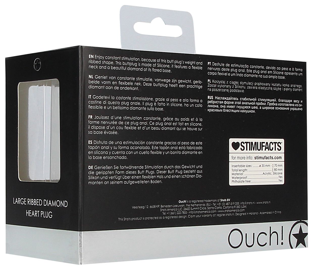 Large Ribbed Diamond Heart Plug - роскошное силиконовое анальное украшение, состоящее из пяти ребер разного диаметра у проникающей части и декоративного украшения в виде кристалла в форме сердца, имитирующего бриллиант. Гладкая обтекаемая форма и небольшой закругленный кончик способствует комфортному проникновению и получению приятных тактильных ощущений. Идеальная игрушка, подходящая для сужения влагалища, подготовки к анальному сексу и украшению тела. Рабочая длина - 7 см.