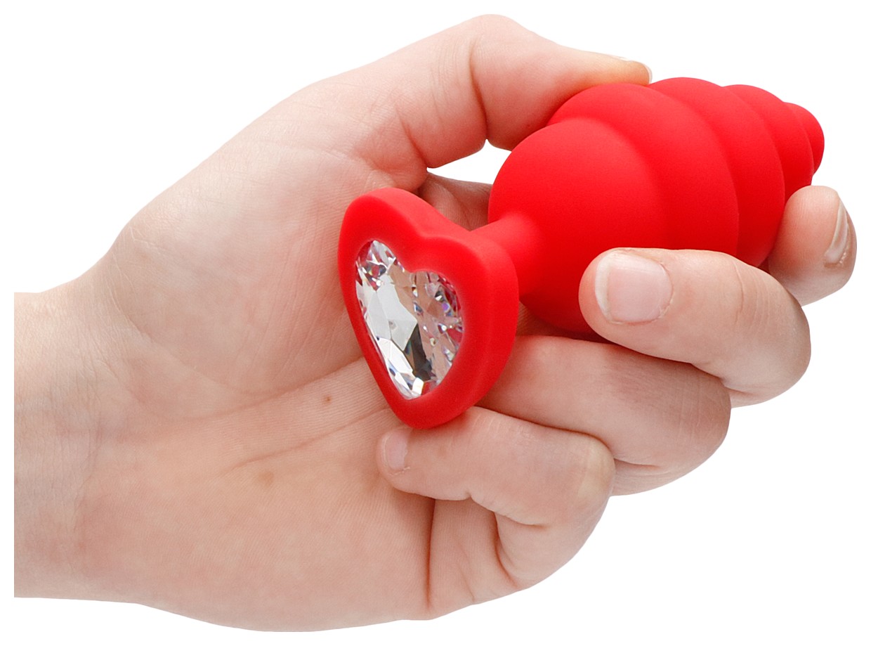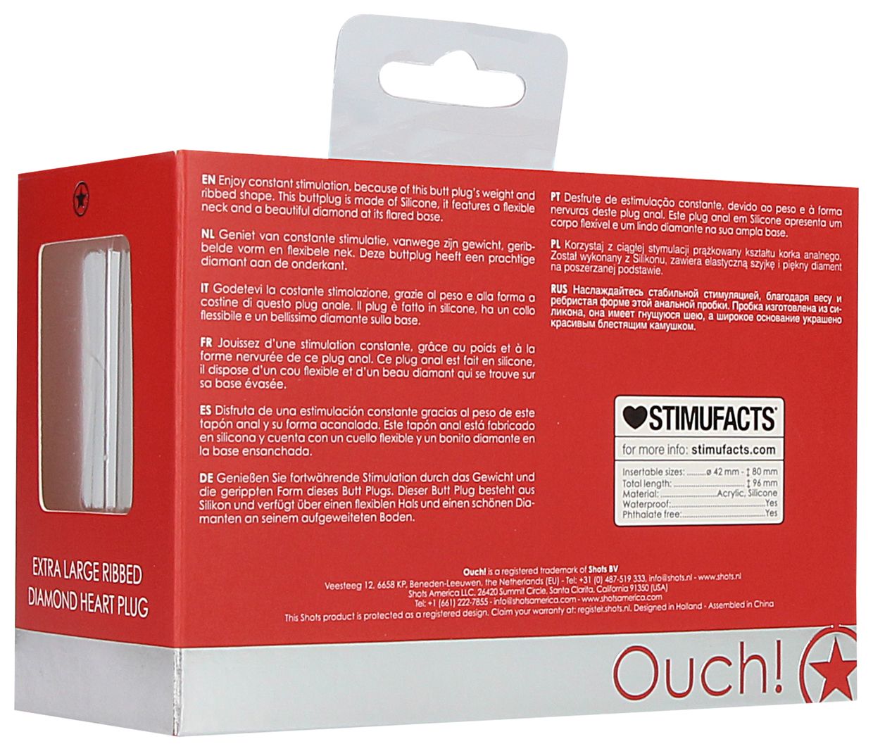 Extra Large Ribbed Diamond Heart Plug - роскошное силиконовое анальное украшение, состоящее из пяти ребер разного диаметра у проникающей части и декоративного украшения в виде кристалла в форме сердца, имитирующего бриллиант. Гладкая обтекаемая форма и небольшой закругленный кончик способствует комфортному проникновению и получению приятных тактильных ощущений. Идеальная игрушка, подходящая для сужения влагалища, подготовки к анальному сексу и украшению тела Рабочая длина - 8 см.