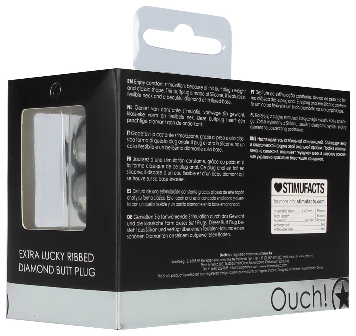 Lucky Diamond Butt Plug - анальная пробка классической формы с прозрачными кристаллами в основании. Идеально подходит для стимуляции, украшения тела, сужения влагалища, подготовки к анальному сексу. Анальная пробка имеет конусообразную форму и гладкую и нежную фактуру. Силикон гарантирует приятные тактильные ощущения и гигиеничность. Рабочая длина - 8 см.