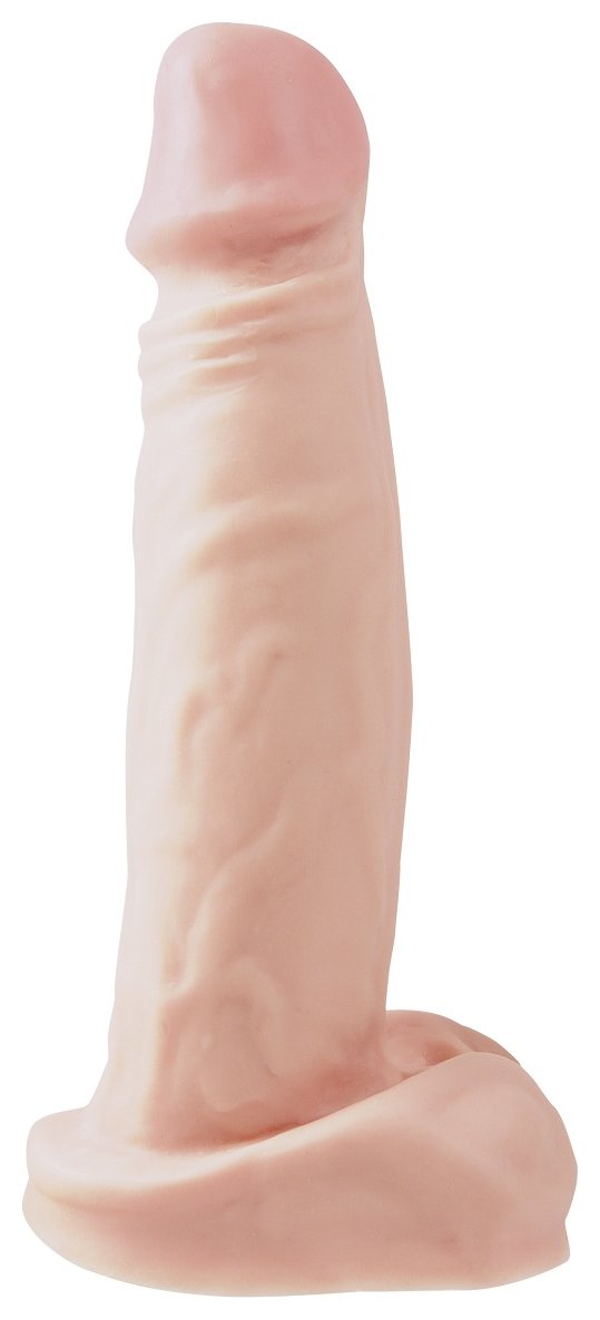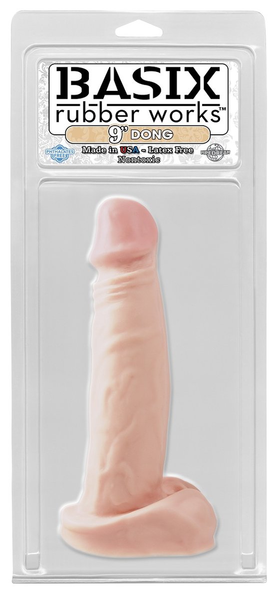 Большой девятидюймовый фаллоимитатор с мошонкой телесного цвета из пвх.