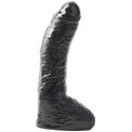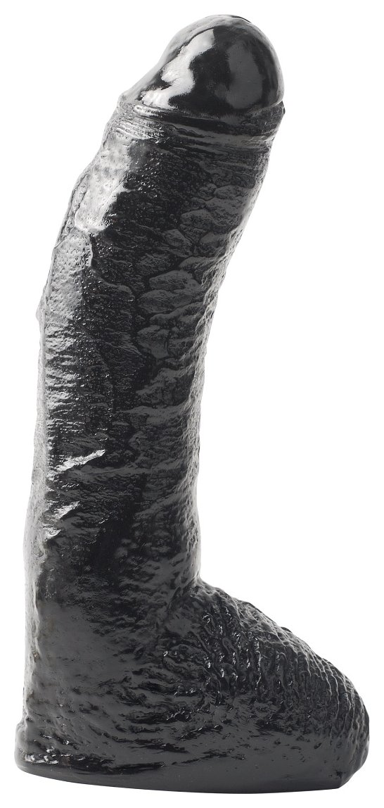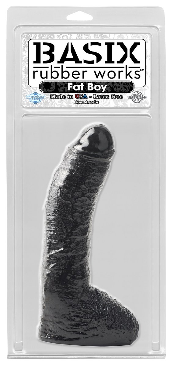 Большой толстый фаллоимитатор из пвх черного цвета. Плоское основание позволяет стоять фаллосу на плоской поверхности.