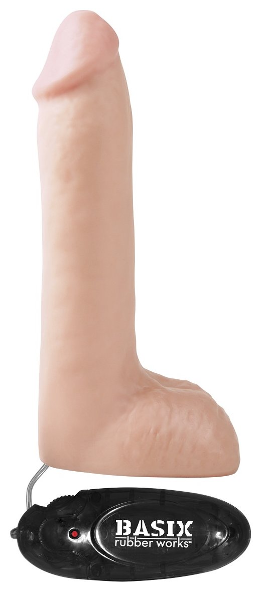 Телесный вибромассажер BASIX. Классический мультискоростной вибромассажер из телесного пвх с мошонкой и выносным пультом управления вибрацией.