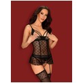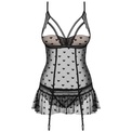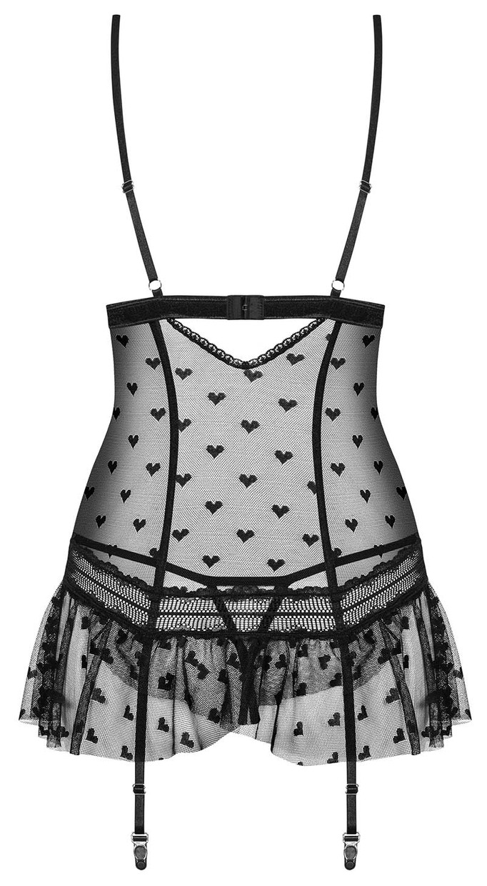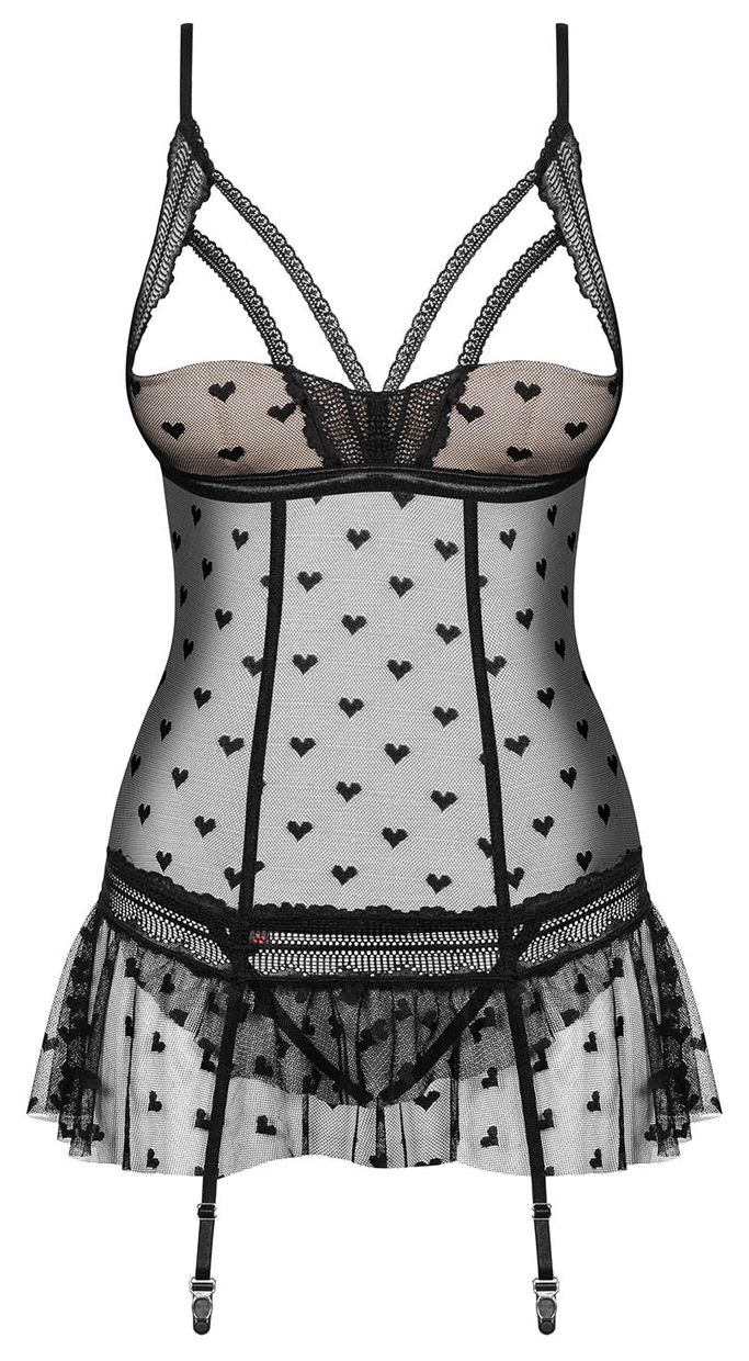 Откровенный корсаж из полупрозрачного тюля с узором в сердечки. Открытые получашечки с бежевым подкладом. Полоски под бюстом превращаются в многоступенчатую застежку на спине. Декоративные тесемки в два ряда и кружево по бокам привлекают внимание к зоне декольте. Бретели регулируются по длине. Кружевная вставка на бедрах и ниспадающая оборка выглядят очень женственно. Пажи позволяют дополнить комплект чулками (в комплект не входят). Мини-стринги с доступом из тонких эластичных лент в комплекте. В комплекте: корсаж, трусики-стринги.