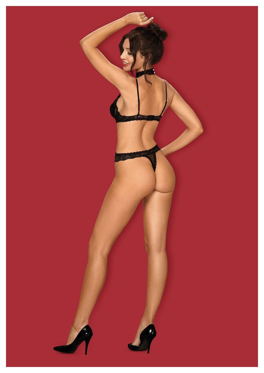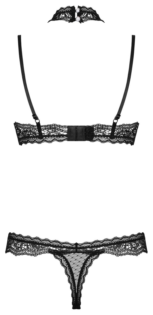 Чувственное боди-стинг изготовлено из прозрачного тюля с геометрическим узором в крапинку. Мягкие чашечки на косточках поддерживают грудь. Кружевное украшение-чокер декорировано пуговками с жемчужинами сзади. Бретели регулируются по длине, сзади застежка на несколько рядов крючков. Боди подчеркивает бедра и ягодицы благодаря оригинальному крою. Кружево по краям добавляет модели женственности.