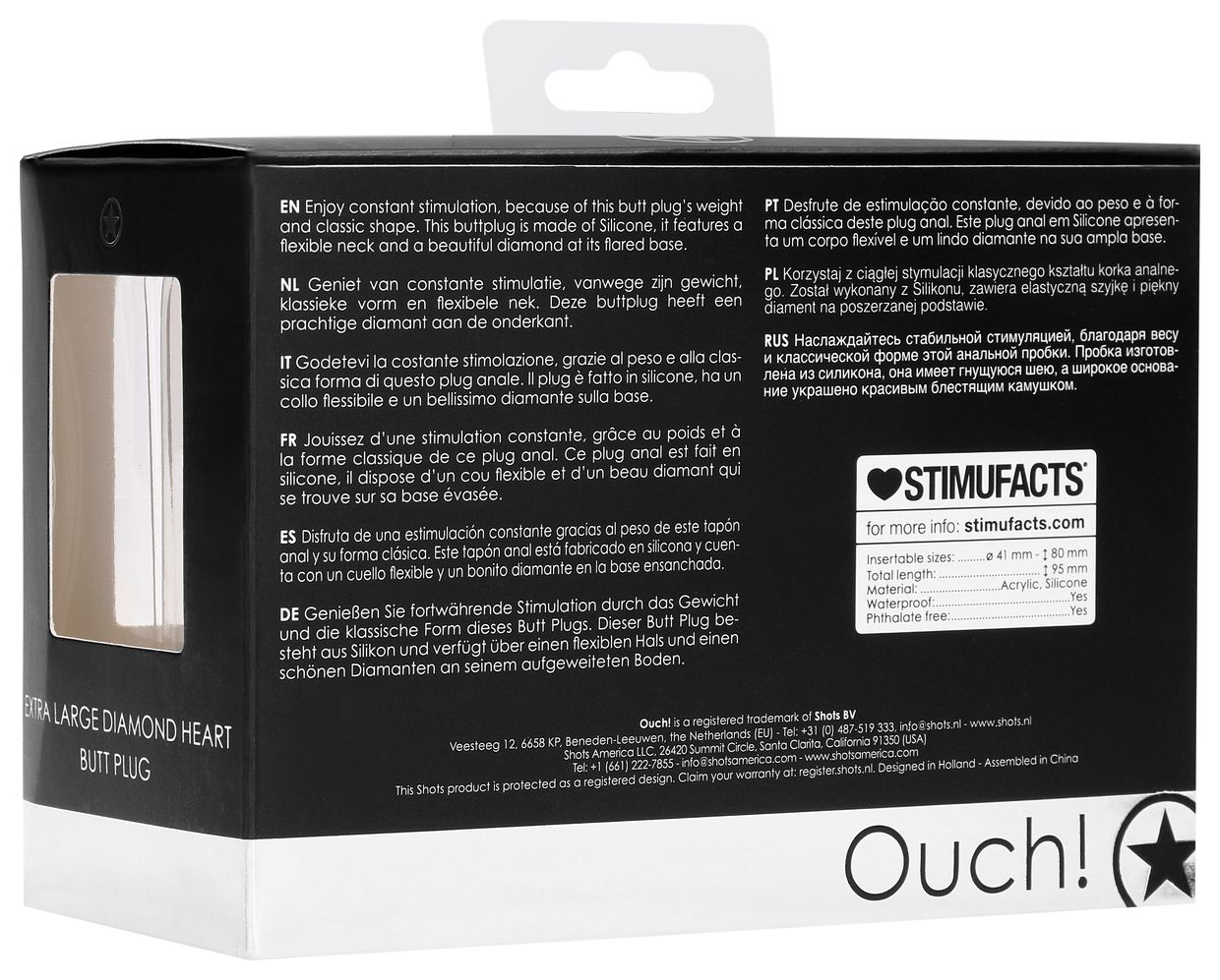 Extra Large Diamond Heart Butt Plug- анальная пробка классической формы с прозрачным кристаллом (стразом)в форме сердца в основании. Идеально подходит для стимуляции, украшения тела, сужения влагалища, подготовки к анальному сексу. Рабочая длина - 8 см.