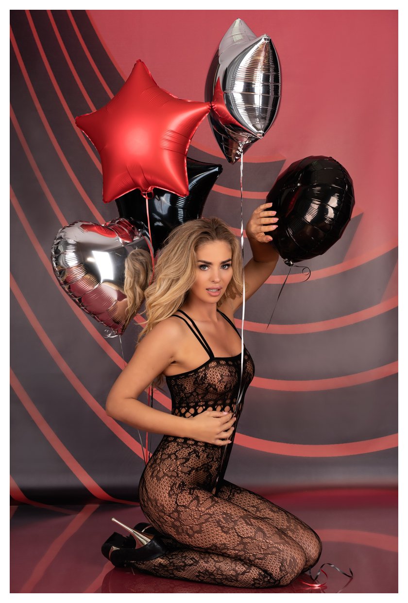 Соблазнительный боди-комбинезон из элегантной сетки c необычным рисунком, облегающий все тело, вызывающе подчеркивает его формы. Тонкие бретели придают ему еще большую пикантность. С разрезом между ножек.