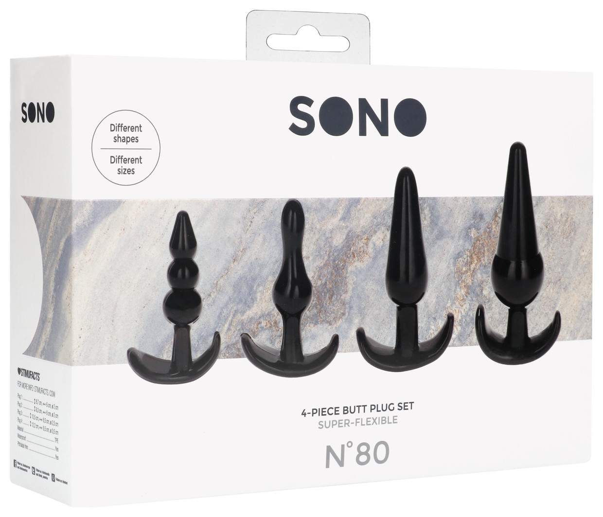 N 80 4-Piece Butt Plug Set – набор из четырех анальных стимуляторов для ношения. В комплект входят четыре анальные пробки разного размера и формы. Гладкая и мягкая подставка в форме треугольника не даст пробке выпасть или, наоборот, провалиться внутрь прямой кишки и делает ее идеальной для ношения. Анальная пробка вставляется в анус после предварительной подготовки. Длина большой втулки – 12,5 см., рабочая длина - 9,5 см., диаметр - 3,7 см. Длина средней втулки - 12 см., рабочая длина - 7,5 см., диаметр - 2,8 см. Длина малой втулки - 9,5 см., рабочая длина - 6,5 см., диаметр - 2,5 см. Длина экстрамалой втулки – 9 см., рабочая длина - 6 см., диаметр - 2,5 см.