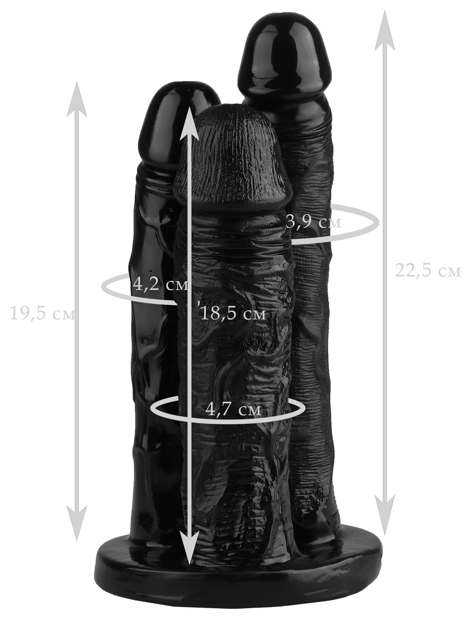Если в ваших интимных фантазиях есть самые сокрушительные мысли о непревзойденном сексе, то теперь Вы сможете воплотить их в реальность. Тройной фаллоимитатор! Тройная стимуляция! Для ценителей потрясающего секса с постоянным обновлением чувств тройная секс игрушка будет главным гостем в вашей постели. Это воплощение всех сексуальных фантазий. Форма и размер каждого предмета выполнена по максимальному подобию мужского пениса, что делает ощущения во время стимуляции вагинального и анального отверстия безумно приятными. Пышные вены тройного фаллоса сделают каждую его обладательницу счастливой и удовлетворенной. Тройной фаллоимитатор изготовлен из практичного и легкого в уходе материала. Длина большого отростка – 22,5 см., диаметр – 3,9 см. Длина среднего отростка – 19,5 см., диаметр – 4,2 см. Длина малого отростка – 18,5 см., диаметр – 4,7 см.