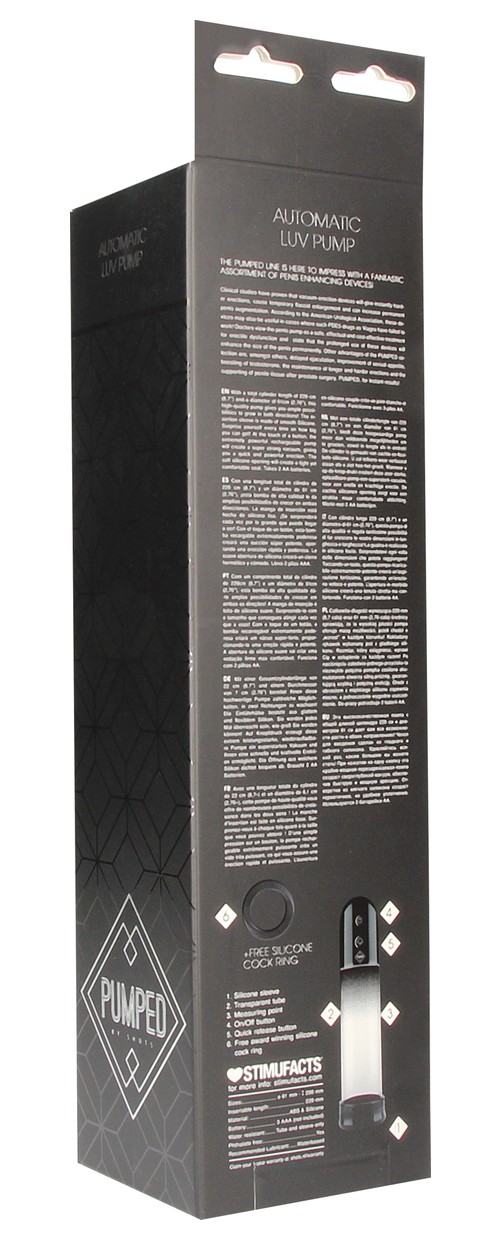 Automatic Luv Pump - автоматическая вакуумная помпа. Клинические исследования доказали, что вакуумные устройства обеспечивают более твердую эрекцию, а также при регулярном использовании увеличение полового органа. Согласно Американской урологической ассоциации, они могут быть также полезны в случаях, когда не помогли препараты на основе фосфодиэстеразы 5 типа, такие как виагра. Вакуумная помпа является безопасным и эффективным методом для профилактики эректильной дисфункции. Для получения максимального эффекта использование помпы должно быть регулярным. Будьте аккуратны и внимательны при работе с вакуумом. Автоматическое управление и мягкая прочная втулка предназначены для создания идеального уплотнения и мощного всасывания. Для быстрого и мгновенного сброса давления есть кнопка предохранительного клапана, так что никаких сюрпризов не будет! Рабочая длина - 20 см. В комплекте: помпа, эрекционное кольцо.