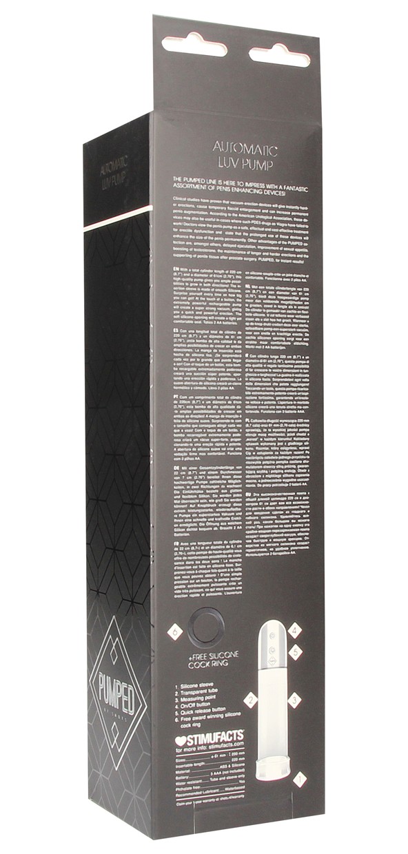Automatic Luv Pump - автоматическая вакуумная помпа. Клинические исследования доказали, что вакуумные устройства обеспечивают более твердую эрекцию, а также при регулярном использовании увеличение полового органа. Согласно Американской урологической ассоциации, они могут быть также полезны в случаях, когда не помогли препараты на основе фосфодиэстеразы 5 типа, такие как виагра. Вакуумная помпа является безопасным и эффективным методом для профилактики эректильной дисфункции. Для получения максимального эффекта использование помпы должно быть регулярным. Будьте аккуратны и внимательны при работе с вакуумом. Автоматическое управление и мягкая прочная втулка предназначены для создания идеального уплотнения и мощного всасывания. Для быстрого и мгновенного сброса давления есть кнопка предохранительного клапана, так что никаких сюрпризов не будет! Рабочая длина - 20 см. В комплекте: помпа, эрекционное кольцо.