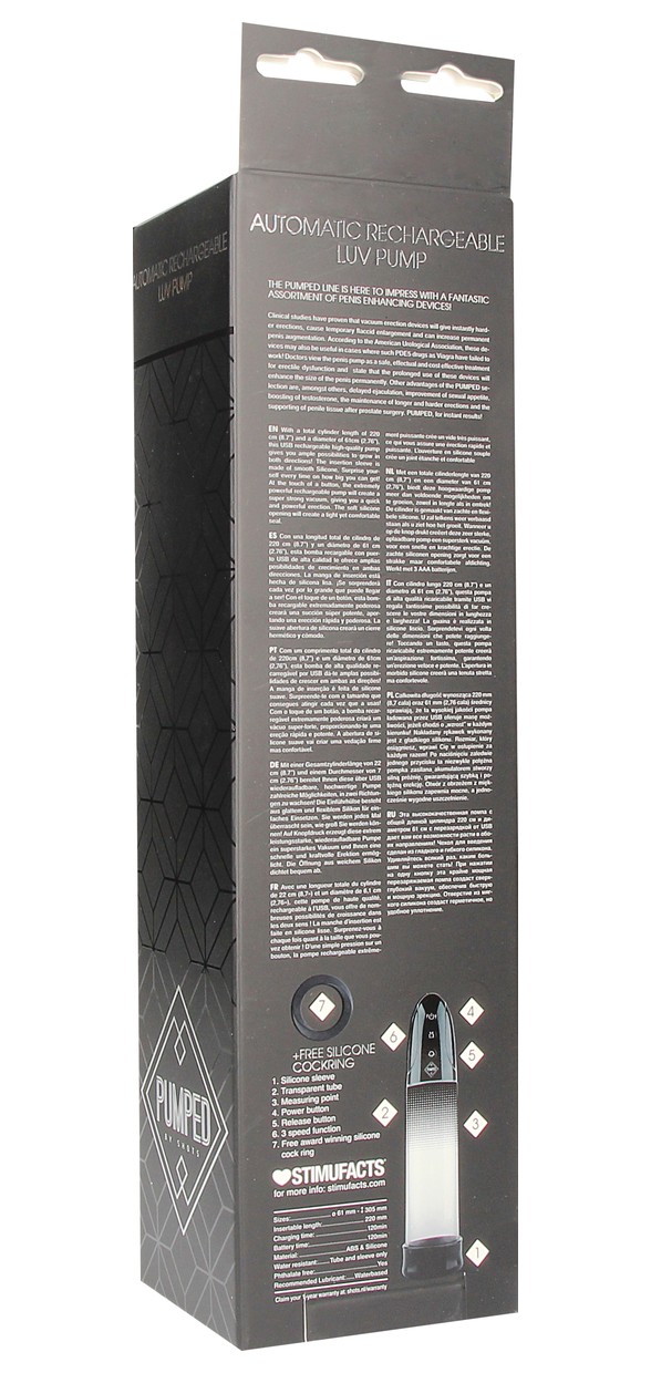 Rechargeable Luv Pump - перезаряжаемая автоматическая вакуумная помпа с 3 скоростями всасывания. Клинические исследования доказали, что вакуумные устройства обеспечивают более твердую эрекцию, а также при регулярном использовании увеличение полового органа. Согласно Американской урологической ассоциации, они могут быть также полезны в случаях, когда не помогли препараты на основе фосфодиэстеразы 5 типа, такие как виагра. Вакуумная помпа является безопасным и эффективным методом для профилактики эректильной дисфункции. Для получения максимального эффекта использование помпы должно быть регулярным. Будьте аккуратны и внимательны при работе с вакуумом. Автоматическое управление и мягкая прочная втулка предназначены для создания идеального уплотнения и мощного всасывания. Для быстрого и мгновенного сброса давления есть кнопка предохранительного клапана, так что никаких сюрпризов не будет! Помпа заряжается через специальный аккумуляторный USB кабель и может быть подключен практически в любом месте. Просто подсоедините идущий в комплекте шнур к изделию и совместимому порту компьютера или USB-адаптера (приобретается отдельно). Полная зарядка занимает 120 минут, ее достаточно для беспрерывной работы в течение 120 минут. Рабочая длина - 20 см. В комплекте: помпа, эрекционное кольцо.