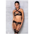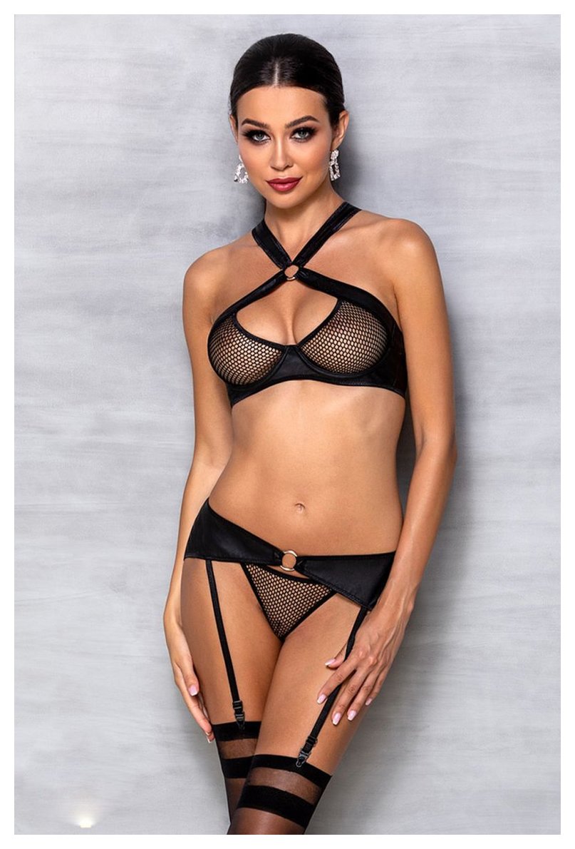 Комплект нижнего белья Amanda. Кожаный бюстгальтер с чувственными вставками из сетки, пояс для чулок и стринги с декоративными золотистыми звеньями в форме колец. Бретельки и застежка на спинке регулируются. В комплекте: бюстгальтер, трусики-стринги, пояс для чулок.