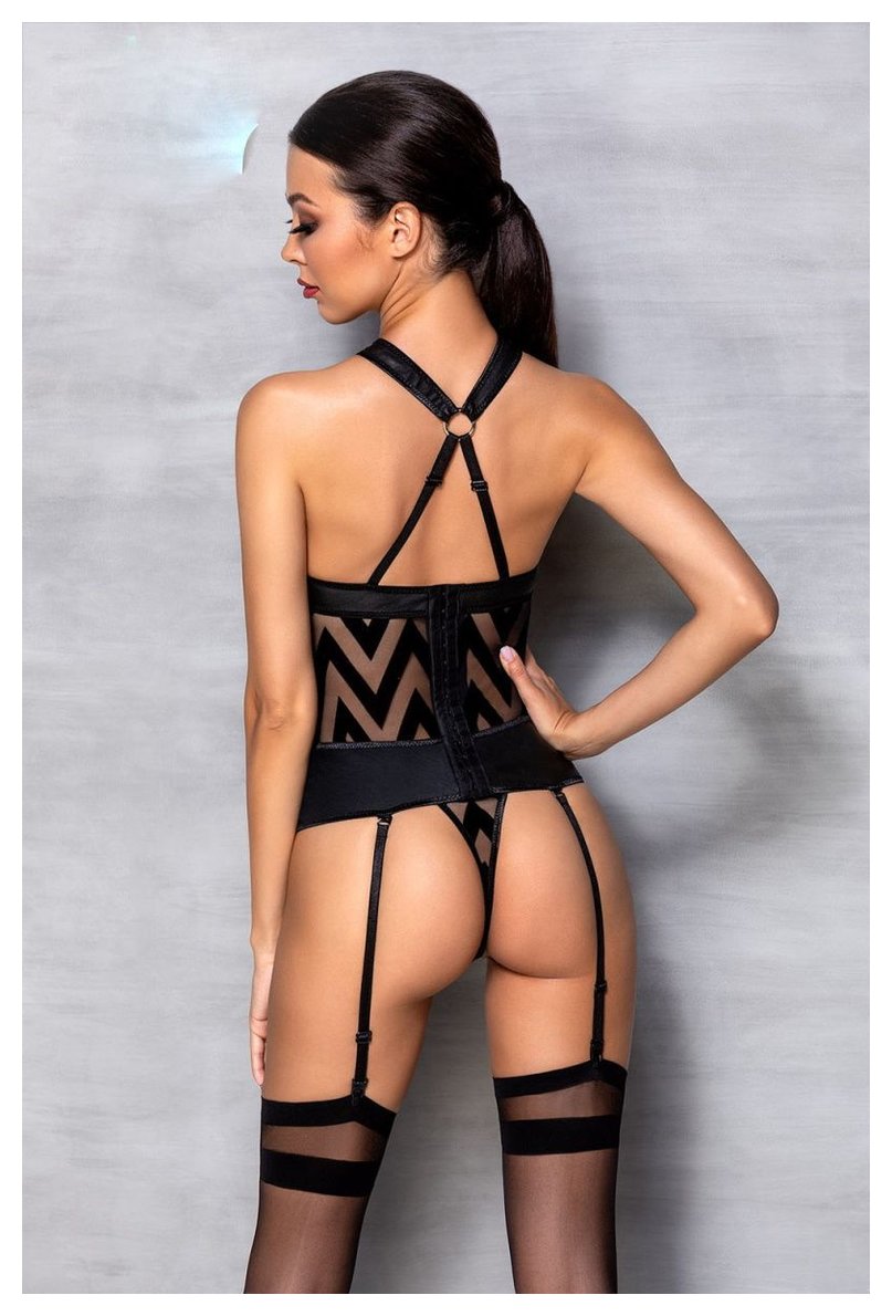 Корсаж Hima - это сочетание имитации кожи и сеточки. Мягкие чашечки на косточках, лямки регулируются, на спинке застежка на крючки-петли. В комплекте: корсаж, трусики-стринги.