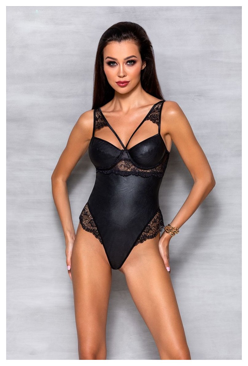 Откровенное боди Loona. Идеальное сочетание тонкого кружева с имитацией кожи. Лямки регулируются, на спине застежка на крючки-петли.