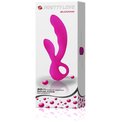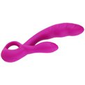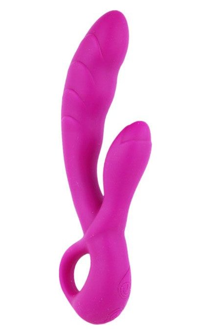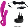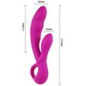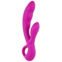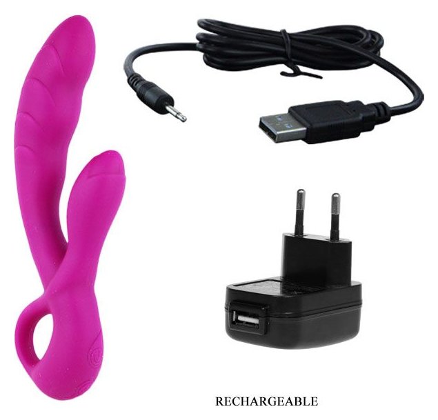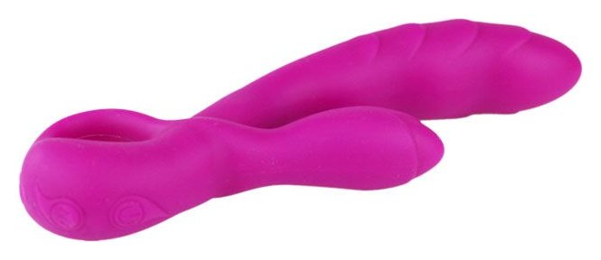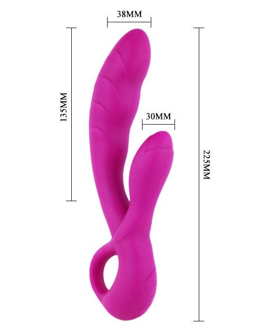 Вибромассажер эргономичной формы, средних размеров. Предназначен для одновременной стимуляции точки G и клитора, на теле массажера имеются три утолщения для точечного приложения вибраций. Имеет увеличенную в диаметре головку с волнообразными ребрышками для стимуляции точки G. Влагостойкий, перезаряжаемый массажер имеет 30 режимов вибрации. Оснащен двумя независимыми моторами. В основании находится кольцо-держатель, для комфортного извлечения. Сделан из гладкого, шелковистого силикона, очень приятного на ощупь. Рабочая длина - 13,5 см.
