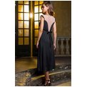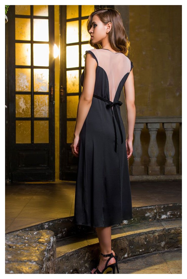 Элегантная длинная сорочка полуприлегающего силуэта с V-образным вырезом горловины на полочке и круглым вырезом горловины на спинке из нейлона и кружева. Сорочка с подрезом под грудью. Лиф полочки выполнен из двух видов ткани: центральная часть лифа - из кружевного полотна, боковые части, переходящие в широкие бретели на полочке - из однотонного трикотажа. Фигурная вставка на нижней части полочки с узким кружевом и V-образная фигурная вставка на спинке выполнены из эластичной стрейч-сетки. Сорочка с коротким втачным рукавом из эластичной сетки, низ рукавов декорирован узким кружевом. Втачной пояс в боковых швах, выполнен из бархатной ленты шириной 2 см, регулирует объем по талии.
