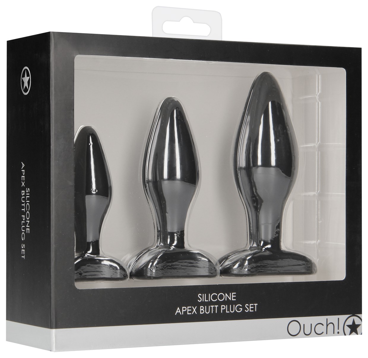 Apex Butt Plug Set - набор из трех анальных пробок разного размера, которые сделаны из шелковистого силикона, и заострены на конце для простого и удобного введения. Эти пробки имеют оригинальную конструкцию, обеспечивающую максимальную анальную стимуляцию, которая затрагивает все нужные места одновременно. Высококачественные материалы, не содержащие фталатов, обеспечат насыщенные и гарантировано безопасные тактильные ощущения. Анальная пробка вставляется в анус после предварительной подготовки. Длина большой втулки - 11,7 см., диаметр - 3,5 см. Длина средней втулки - 10 см., диаметр - 2,9 см. Длина малой втулки - 8,3 см., диаметр - 2,3 см.
