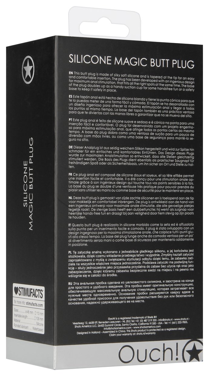 Magic Butt Plug - это анальная пробка из шелковистого силикона, которая имеет оригинальную ребристую конструкцию, обеспечивающую максимальную анальную стимуляцию, затрагивая все эрогенные места. Основание пробки с присоской для получения удовольствия без рук.