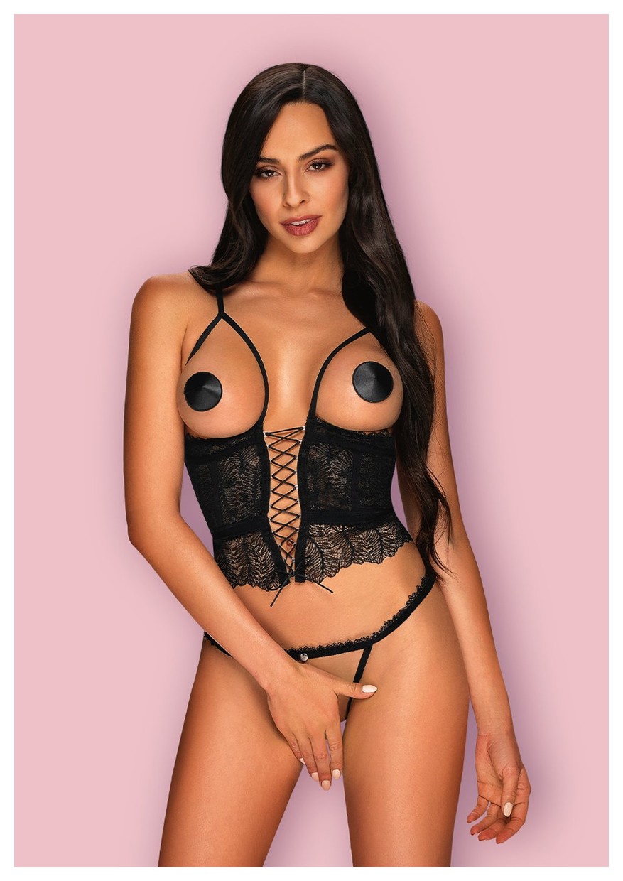 Ультрачувственный корсаж Romanesa с открытыми чашками и стринги с доступом. Бретели регулируются по длине, спереди соблазнительная шнуровка. Стринги сзади украшает пикантная кисточка. Изделие упаковано в плотную красивую коробку и отлично подойдет в качестве оригинального подарка. В комплекте: корсаж, трусики-стринги.
