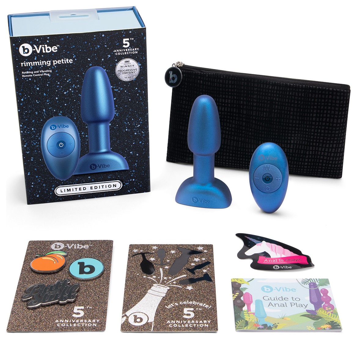 Rimming Petite широко известна как лучшая секс-игрушка, которую стоит попробовать, если вы новичок в анальной игре. Лимитированная коллекция, посвященная 5-й годовщине компании b-Vibe, с новым великолепным сверкающим цветом, футляром для переноски в ограниченном выпуске и другими юбилейными подарками! Анальный плаг премиум-качества, который собрал в себе функции для идеальной анальной стимуляции. Выполнен из гипоаллергенного и гигиеничного шелковистого силикона, имеет надежное ограничительное основание для безопасного удовольствия. Пробка может управляться с радио-пульта, который есть в комплекте (радиус действия до 9 м), а может управляться кнопкой, расположенной в основании игрушки. Что же такого особенного в этой пробке? Один из самых чувствительных участков анальной зоны расположен в районе сфинктера. Поэтому людям доставляет такое большое удовольствие римминг. Поэтому в b-Vibe в основании расположены металлические шарики, которые имеют 6 скоростей вращения. При этом в головке плага расположен мощный мотор с 6 различными функциями - постоянная вибрация, волнообразная вибрация, пульсирующая и нарастающая вибрация, также колебательный и произвольный режимы. Моторчик в головке и вращение шариков могут работать одновременно, а могут по отдельности. Ручное управление позволяет использовать 9 режимов, которые переключаются простым нажатием на кнопку в основании плага. Пробка имеет бесконтактную зарядку от USB, когда индикатор мигает - устройство в процессе зарядки, когда огонек горит постоянно - устройство полностью заряжено. Для первой зарядки требуется 2,5 часа, обычно достаточно 2 часов, тогда пробка сможет проработать целых 60 минут! Пульт управления работает от 1 батарейки типа CR2032. Рабочая длина - 10 см.