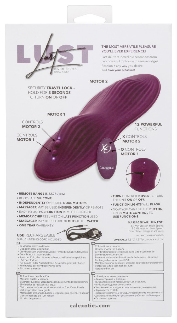 Вибромассажер Lust Remote Control Dual Rider. Массажер с двумя двигателями и дистанционным управлением с помощью миниатюрного пульта, 12 функциями интенсивной вибрации и продуманной рельефной стимулирующей зоной для трения. Безупречный дизайн гарантирует удовольствие от игры, а прочная конструкция обещает бесчисленные часы удовольствия.