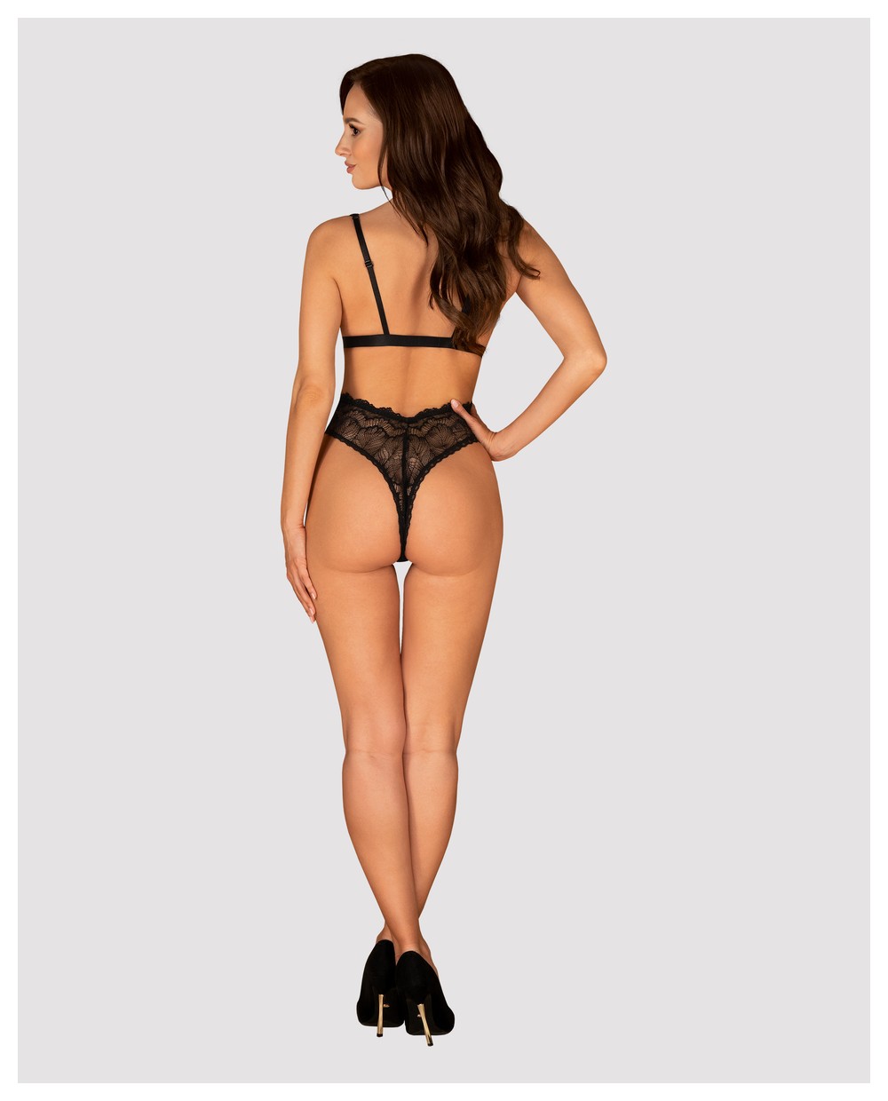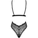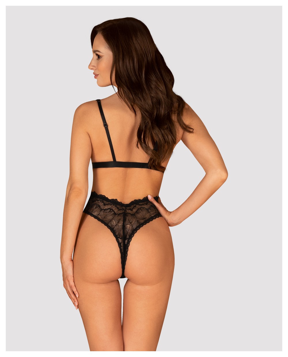 Пикантное боди-стринг из коллекции Isabellia создано из широких кружевных полос с очень глубоким декольте. Под бюстом застежка и бант из атласных лент. Тонкие бретельки регулируются по длине.