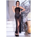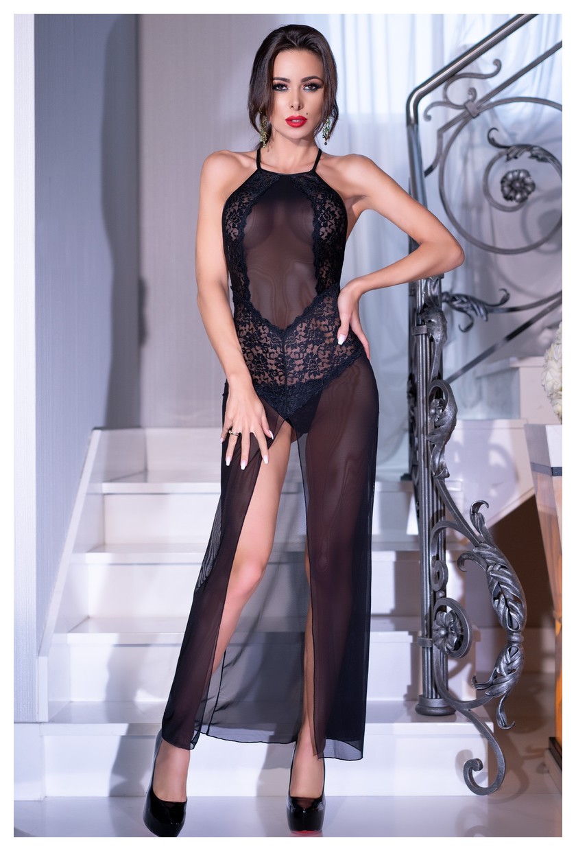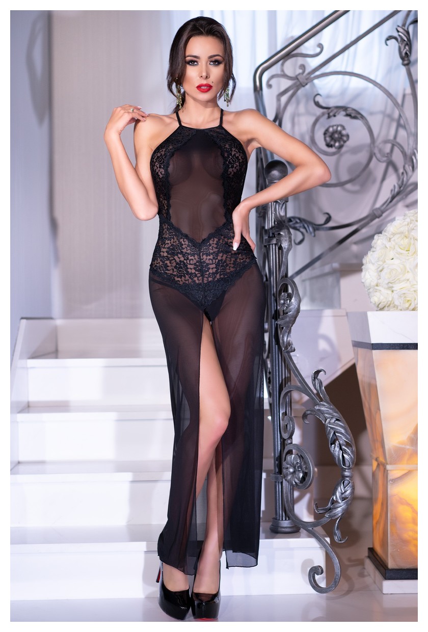 Сорочка длинная из кружевной и прозрачной вуали, бретели регулируются по длине, перекрещиваются на спине, длинный разрез спереди открывает ножки. Сорочка комплектуется стрингами. В комплекте: сорочка, трусики-стринги.