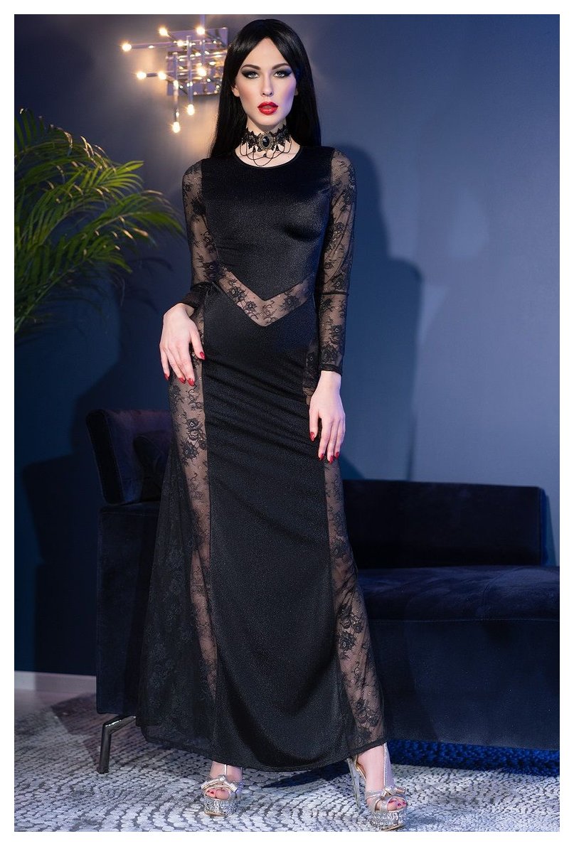 Платье длинное, сложного кроя, из микрофибры. На юбке по бокам вставки из гипюра с цветочным рисунком, полностью открывают ноги. Рукава длинные из гипюра, горловина круглая. Комплектуется стрингами. В комплекте: платье, трусики-стринги.