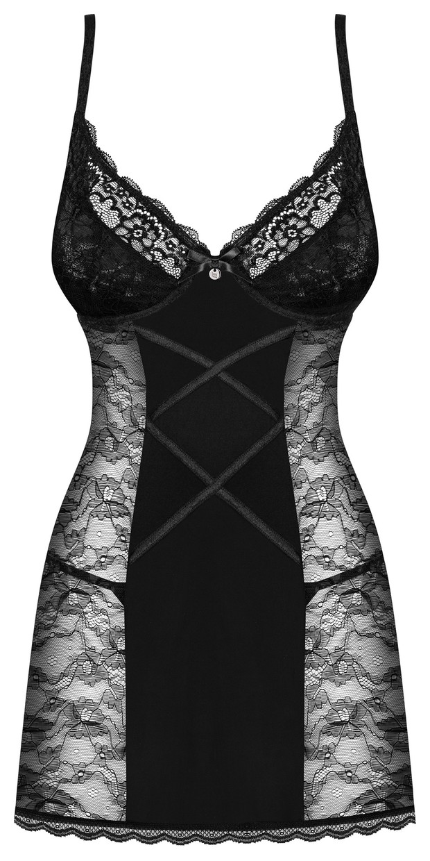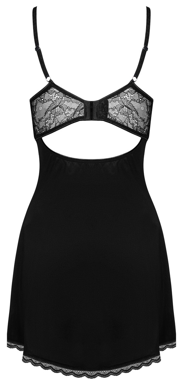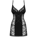 Сорочка из серии Laurise из эластичной ткани. Вставки из гипюра визуально вытягивают силуэт, бюстгальтер на косточках идеален для большой груди, на спине застёжка-удлинитель, бретели регулируются по длине. В комплекте: сорочка, трусики-стринги.