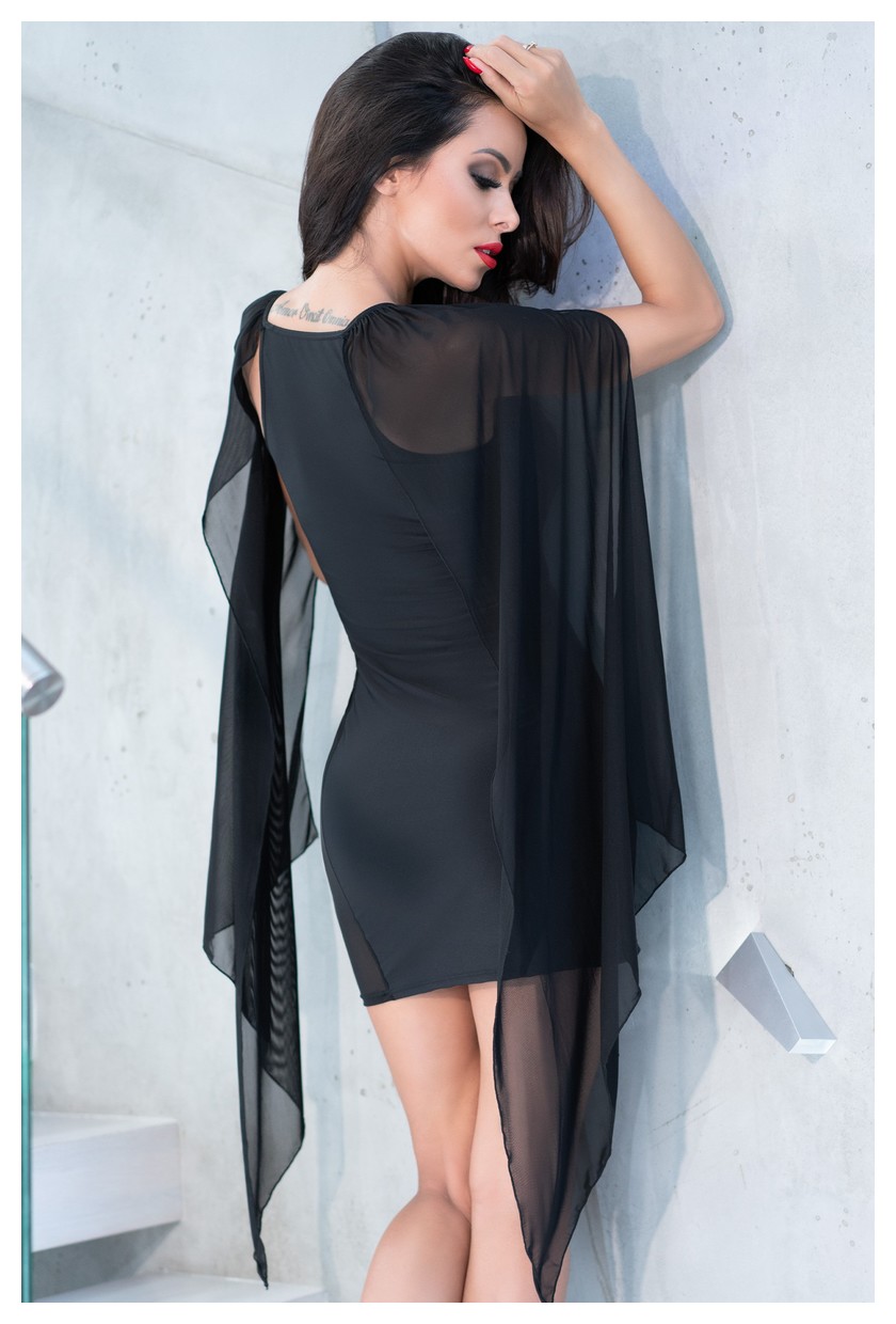 Мини-платье из плотной ткани, по бокам вставки из сетки, на шее застёжка, на руки ниспадает длинная вуаль.