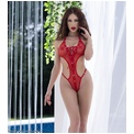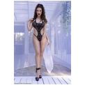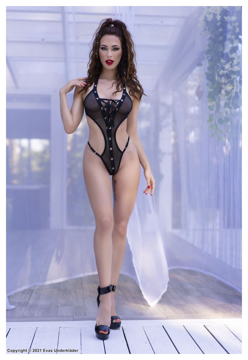 Сексуальное боди-стринг сложного кроя из сетки, с тонкими союзками, регулируемыми по длине, на спине застежка. Спереди декоративная планка с металлическими кнопками и декоративная шнуровка.
