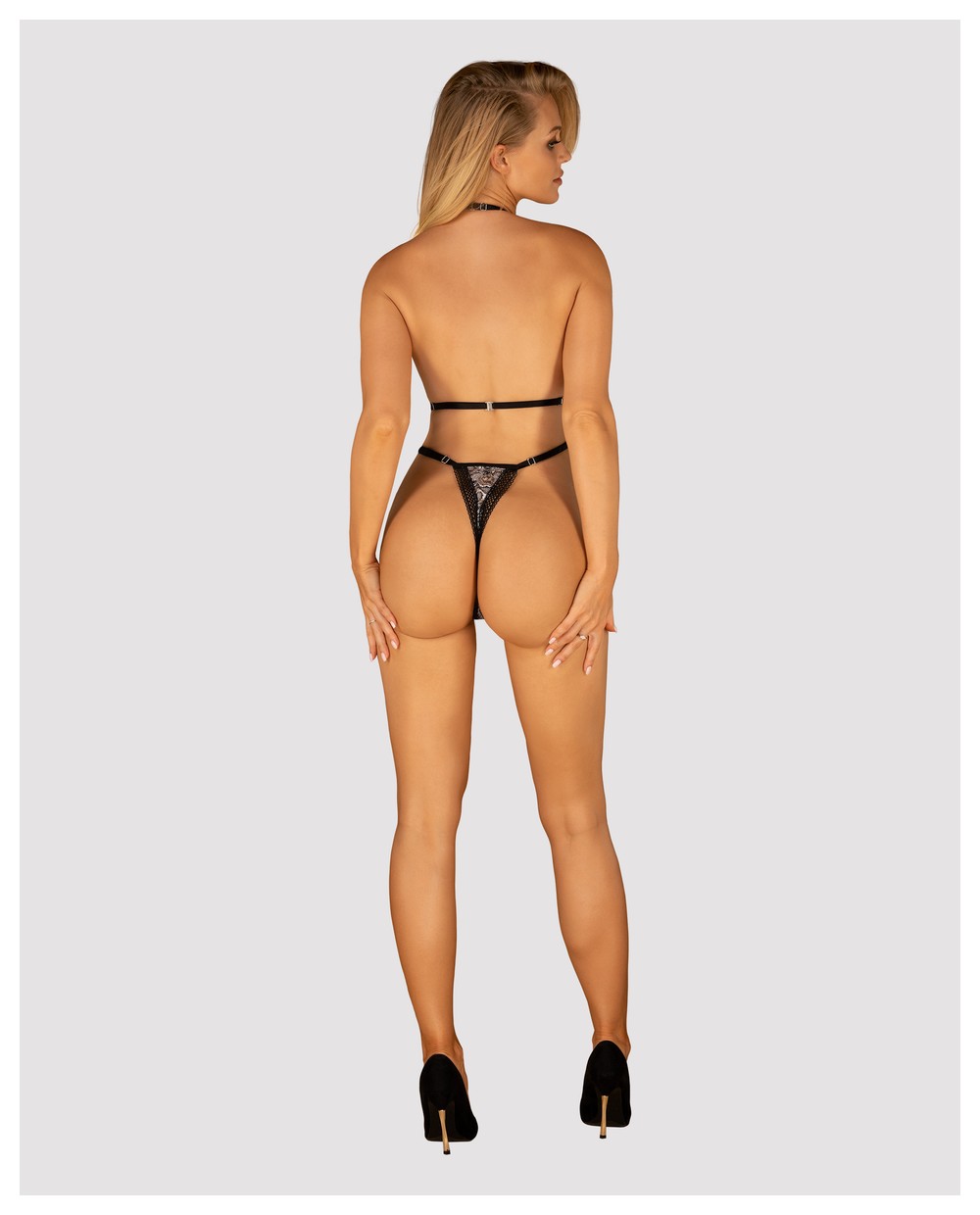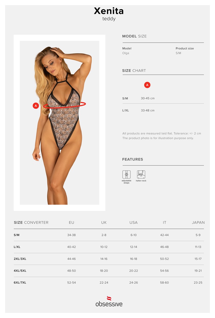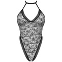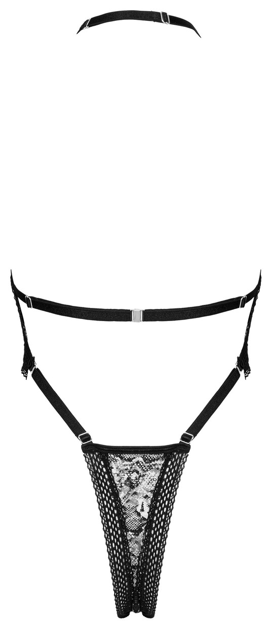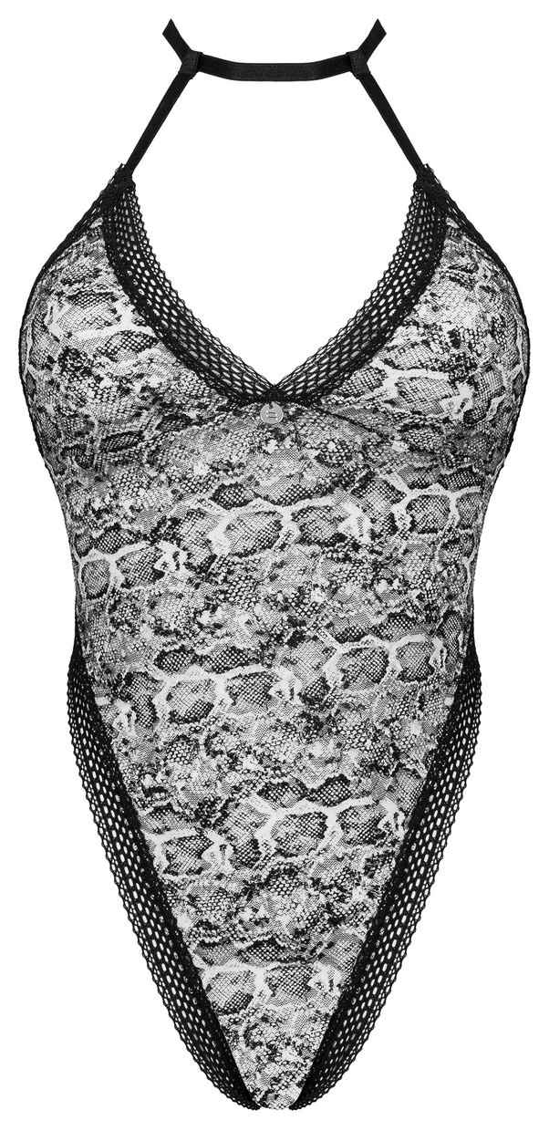 Боди-стринг для девушки из коллекции Xenita из вуали с анималистичным принтом с кружевной отделкой, тонкие бретельки регулируются по длине, застежки на шее и на спине. Спинка открыта.
