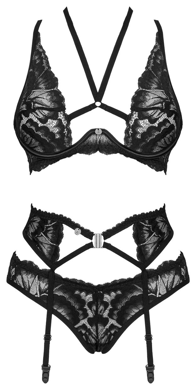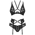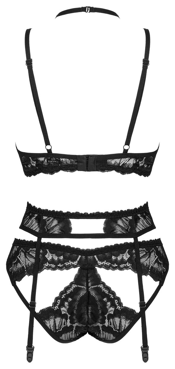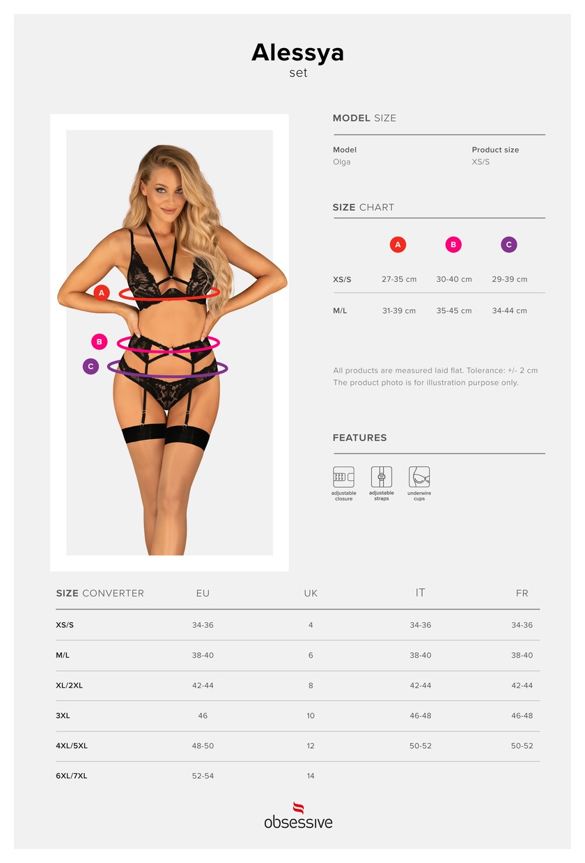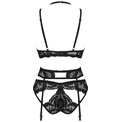 Комплект белья из кружева из трёх предметов серии Alessya. Мягкий бюстгальтер сложного кроя на косточках. Тонкие бретели регулируются по длине, на спине застёжка-удлинитель, в зоне декольте тонкие бретели. Пояс с пажами для чулок застегивается спереди. Трусики-панти с вырезами на ягодицах завершают идеальную картинку, ластовица из хлопка. В комплекте: бюстгальтер, трусики, пояс для чулок.