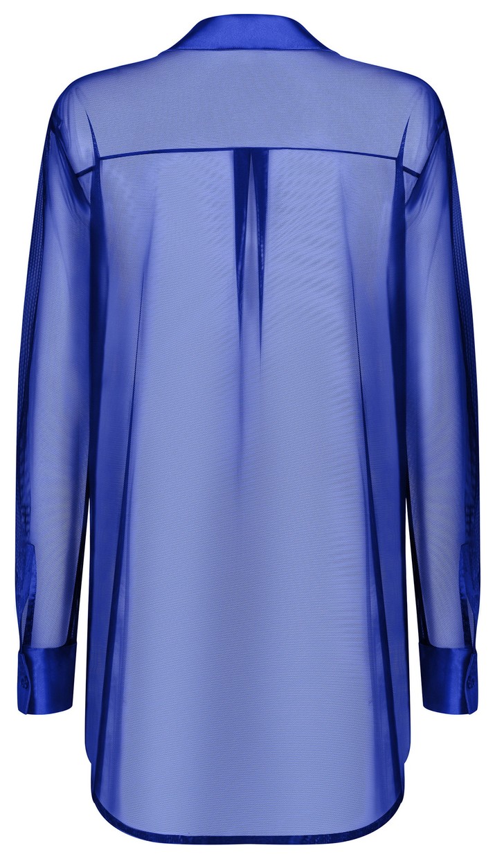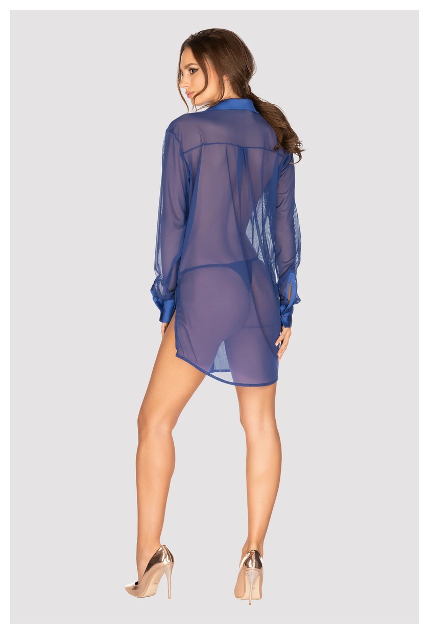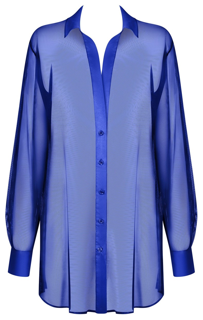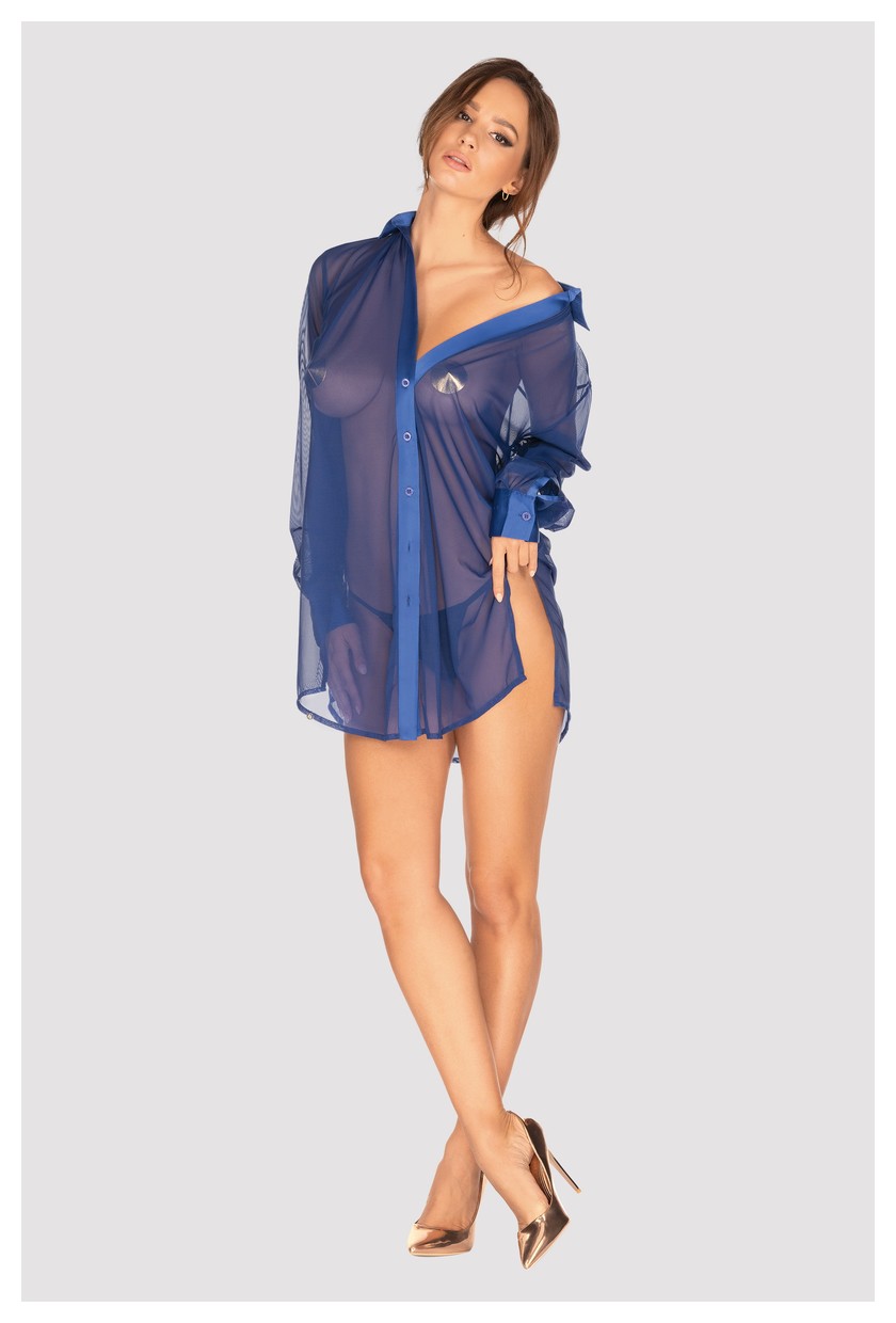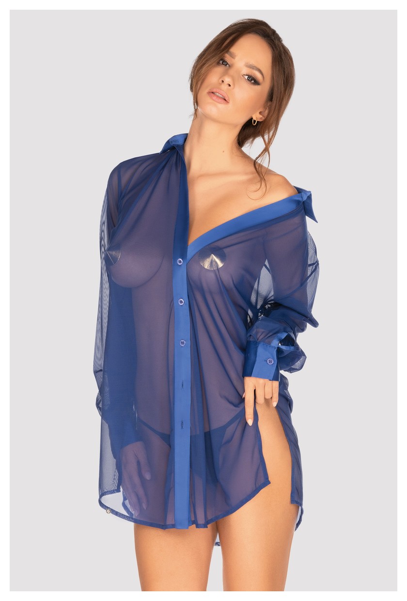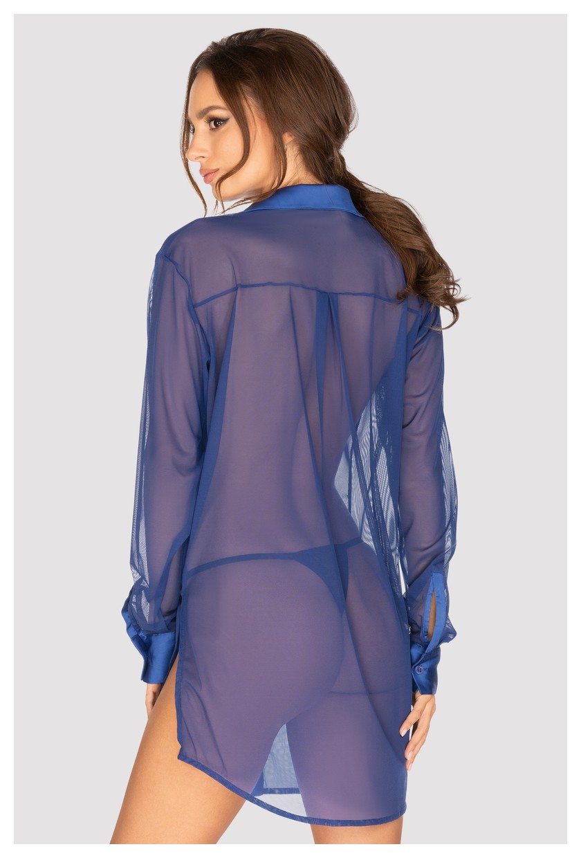 Рубашка Stellya выполнена из полупрозрачной вуали. Рубашка с длинным рукавом, с застежкой на пуговицы, по бокам разрезы. Ворот, манжеты и планки полочек из атласной ткани.