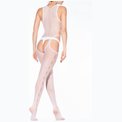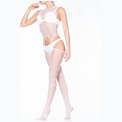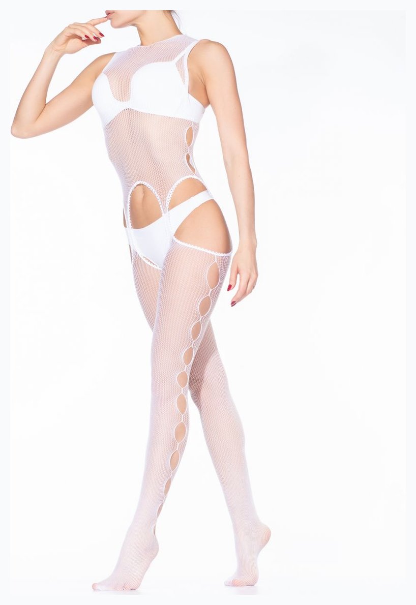 Сексуальное ажурное боди в мелкую сетку, полностью прозрачное, без поясной части, с пикантными разрезами по бокам. Топ и чулки соединены специальными перемычками с кружевной отделкой.