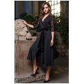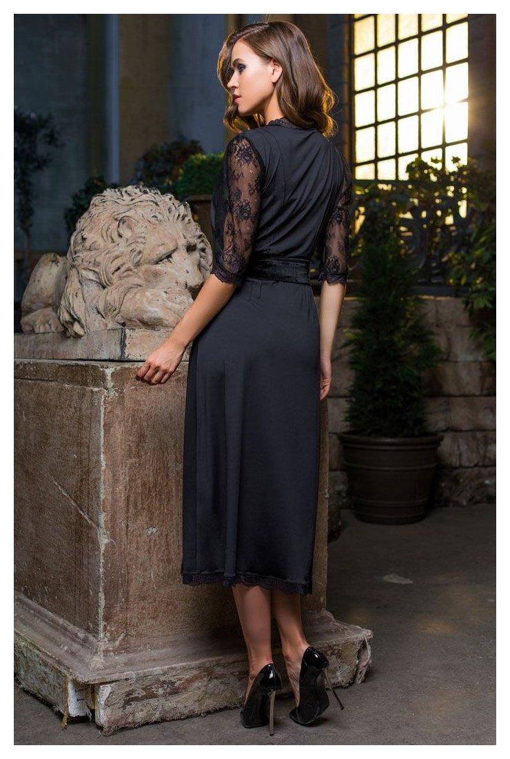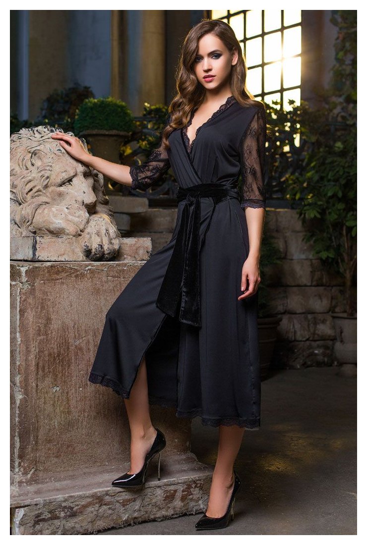 Элегантный длинный халат из мягкого нейлона-трикотажа. Горловина и низ рукавов обработаны пришивным кружевом в цвет. Борт халата декорирован тонкой бархатной лентой. Рукава по локоть выполнены из кружевного полотна. По полочке и спинке выполнены рельефы для лучшего прилегания по фигуре. Пояс втачной, выполнен из бархата с атласной подкладкой. Халат с боковыми карманами.