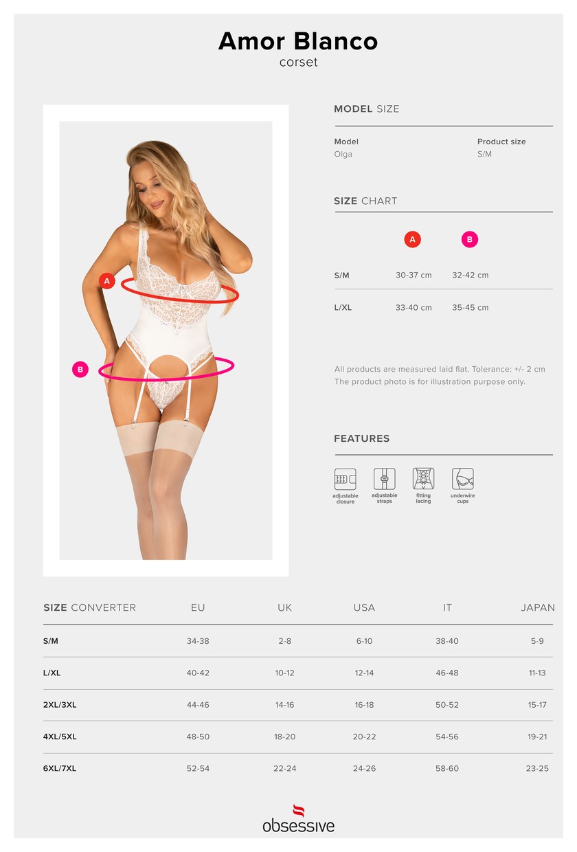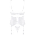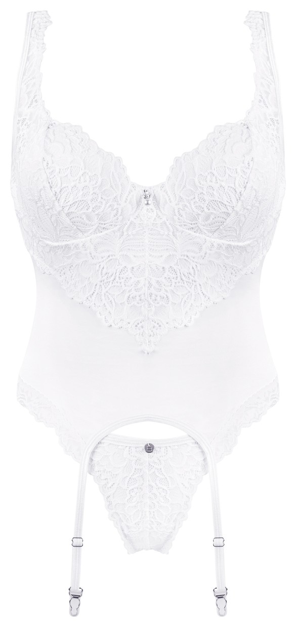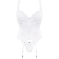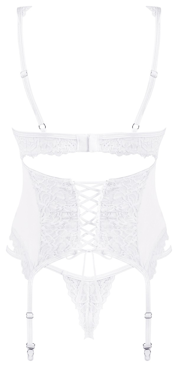 Женский корсаж выполнен из эластичной ткани с кружевными вставками. Лиф кружевной на косточках, на спине корректирующая размер шнуровка и застежка на удлинитель, бретели и пажи для чулок регулируются по длине. Кружевные трусики-стринги. В комплекте: корсаж и трусики-стринги