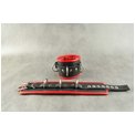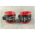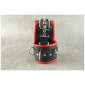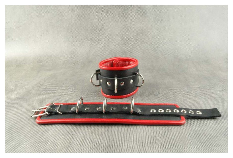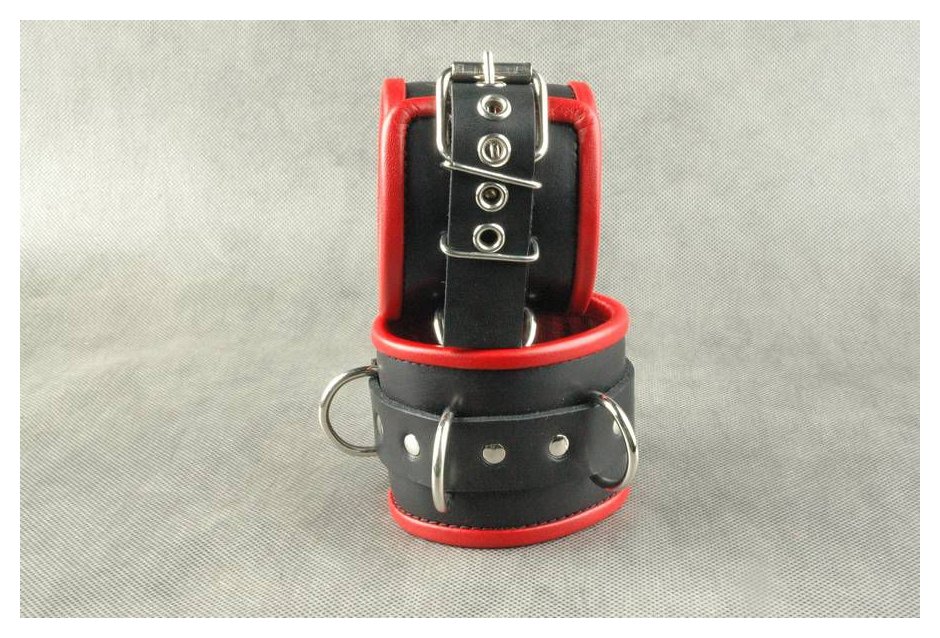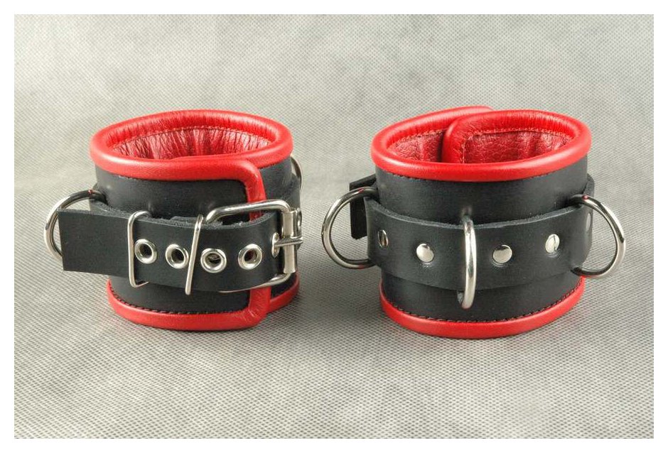 Наручники подшитые. Застежка - ремешок с металлической пряжкой. Имеются 3 сварных кольца. Отделочный край и мягкая проставка внутри, обтянуты красной кожей. Не имеет соединительной фиксации. Ширина - 7 см.