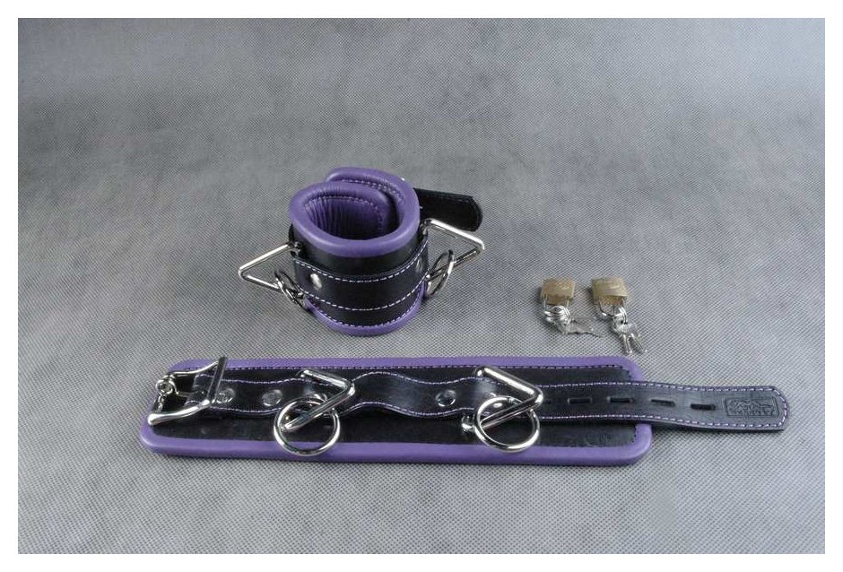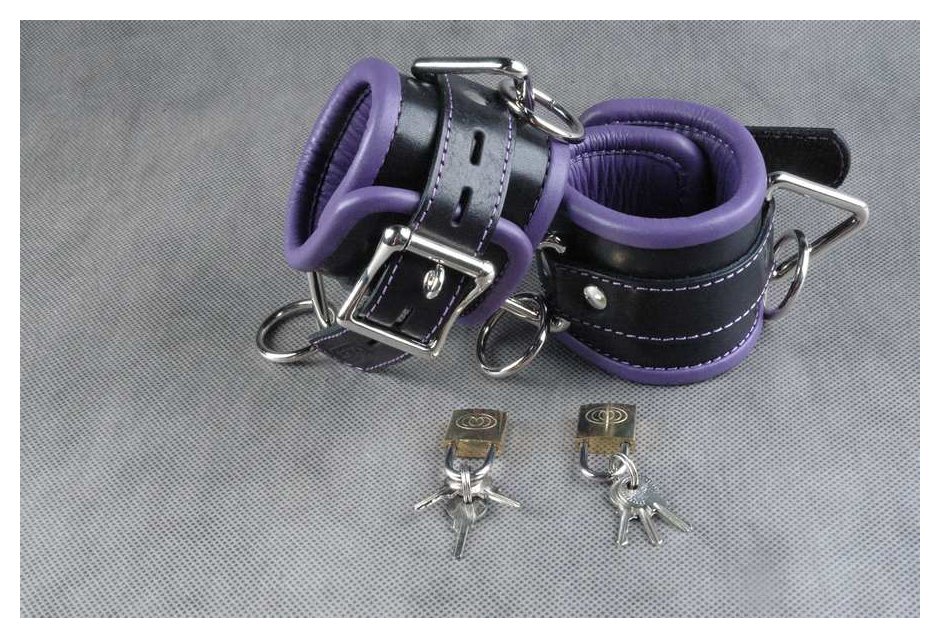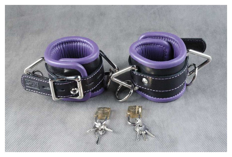 Подвёрнутые кожаные наручники с фиолетовым подкладом