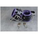 Обернутые застежка - ремешок с эллипсами-отверстиями и запирающейся пряжкой-«бабочкой», с замочком для фиксации. База с 2 треугольниками с кольцом, с мягкой проставкой внутри, обтянутой лиловой кожей с обернутым краем. Без соединительной фиксации. Ширина - 6,5 см.