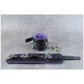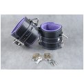 Подвернутые застежка - ремешок с эллипсными отверстиями и запирающейся пряжкой «бабочкой», с замочком для фиксации. База с 2 треугольниками с кольцом, с мягкой проставкой внутри, обтянутой лиловой кожей с подворотом, без соединительной фиксации. Ширина - 6,5 см.