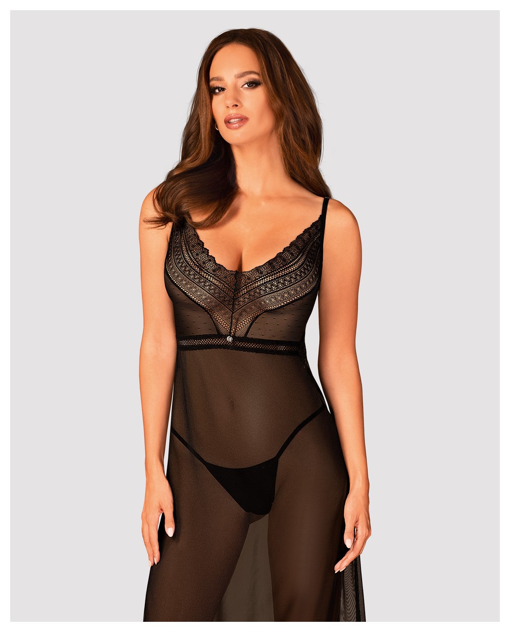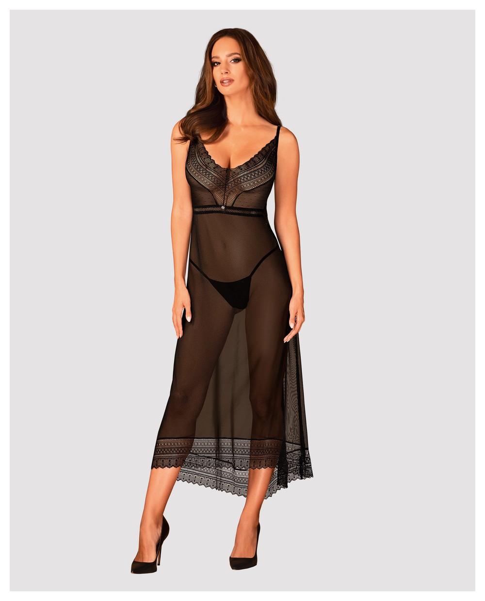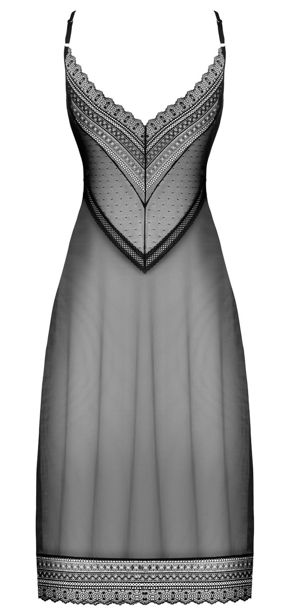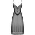 Сорочка Estiqua ассиметричного кроя выполнена из прозрачной эластичной ткани. Лиф и спинка с V-образными вырезами из кружевного полотна с геометрическим рисунком, бретели регулируются по длине, подол украшен широким кружевом. Элегантный серебристый кулон на талии привлекает внимание.