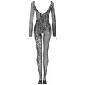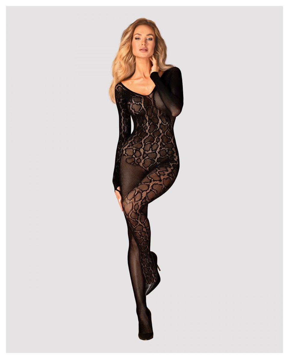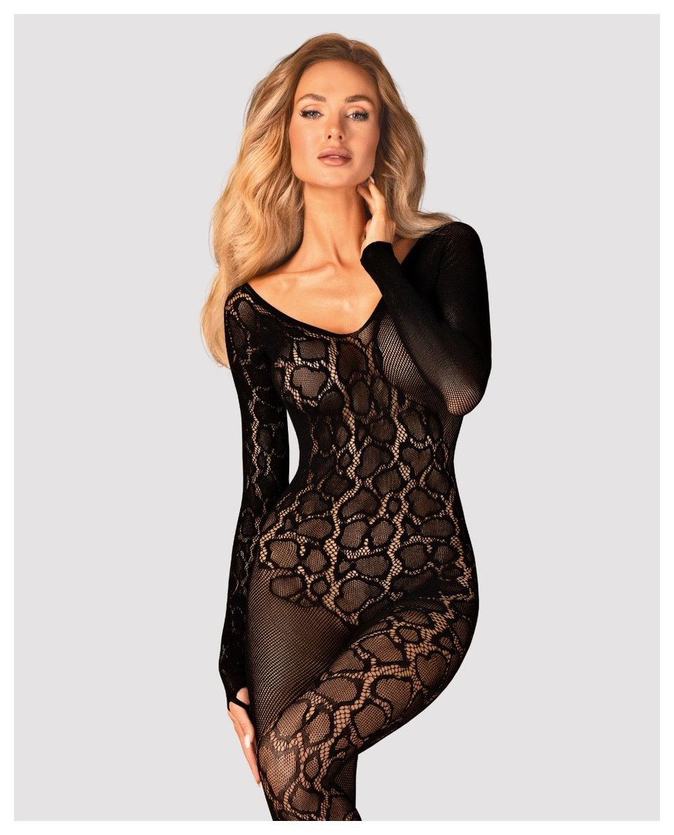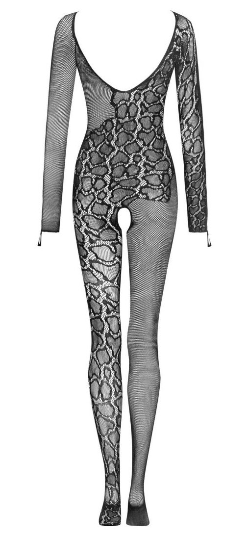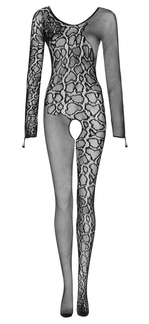 Эластичный кружевной кэтсьюит с глубокими V-образными вырезами спереди и сзади, открытой промежностью, с уникальным змеиным рисунком. Рукава длинные с петлей на палец.