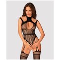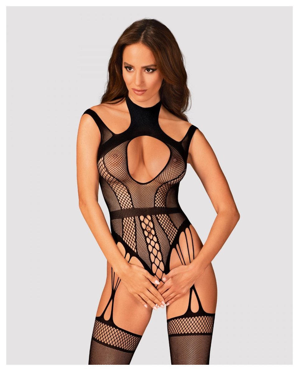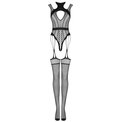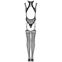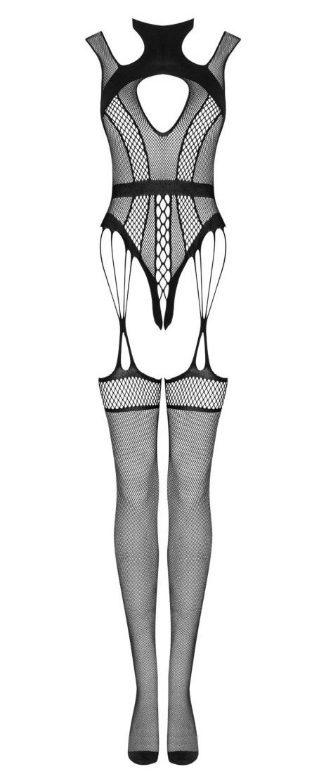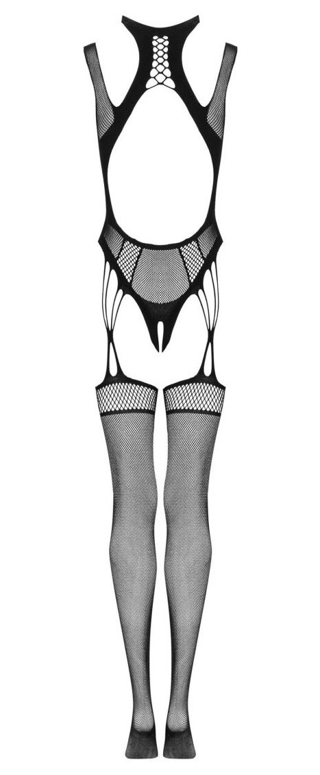 Эластичный кэтсьюит из мягкой сетки с геометрическими вырезами, открытой спиной и открытой промежностью. Стилизовано под боди с чулками.