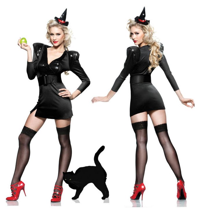 Роскошный костюм важной колдуньи - мини-платье с переливающимся верхом и остроконечными плечиками. В наборе маленькая шляпка с потайной заколочкой и широкий ремень.