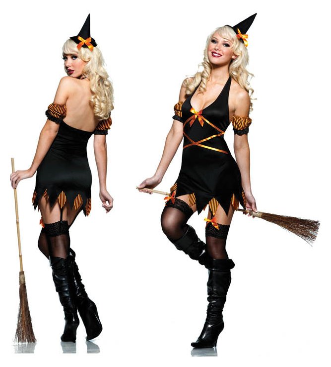 Платьице с полуоткрытой спиной и глубоким декольте спереди, украшенным рыжим бантом. Подол платья неровный - с зазубринами из черной и оранжевой ткани. В комплекте рукавчики и остроконечная шляпка с потайной заколкой и отстегивающиеся пажи для чулок.