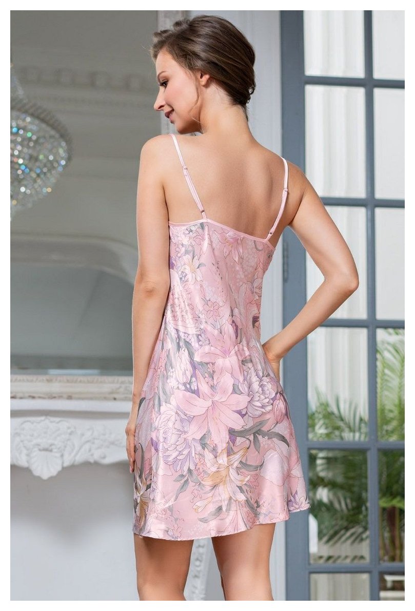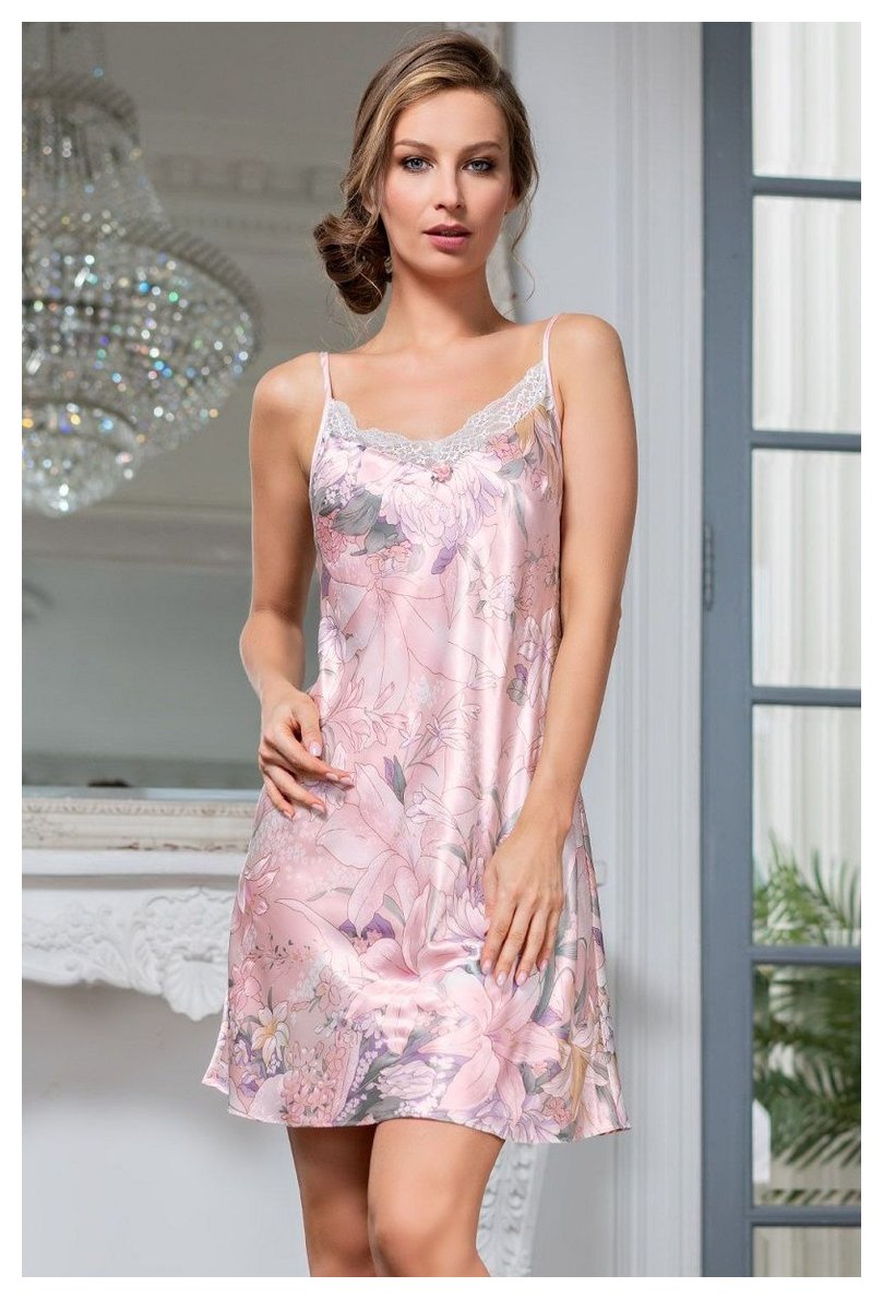 Короткая сорочка на тонких бретелях без подреза под грудью, выполнена из смесовой ткани с эффектом объемного 3D-рисунка. Ажурное кружево расположено по вырезу сорочки. Декор – атласный цветок по центру.