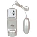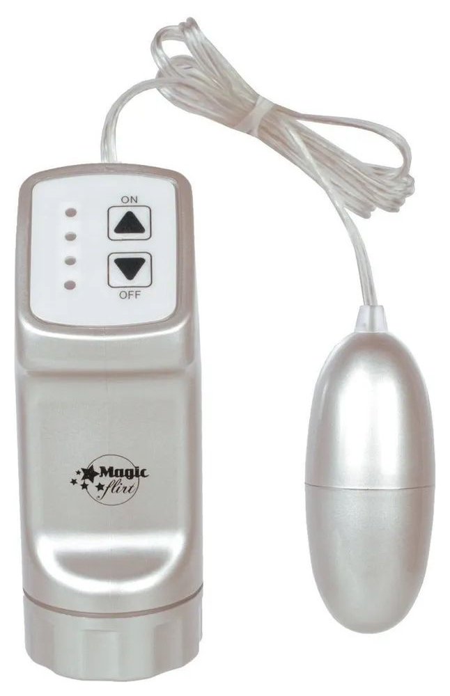 Серебристое виброяйцо с пультом управления на проводе. Подходит для клиторальной стимуляции, массажа эрогенных зон, вагинального введения. Имеет 4 режима работы.