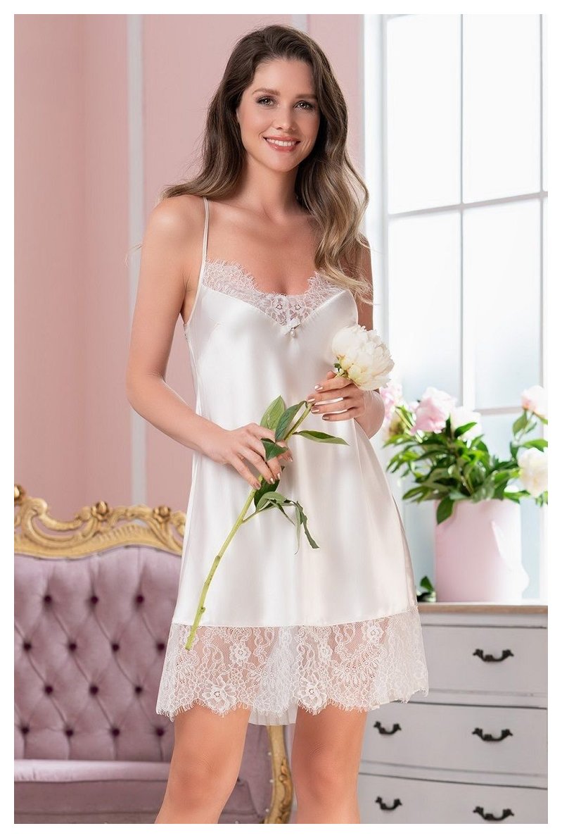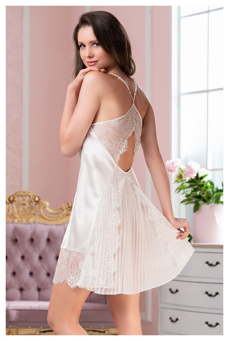 Короткая сорочка на тонких регулируемых бретелях из полиэстрового атласного полотна выполнена в сочетании с тонким кружевом и шифоном-плиссе. Эффектная вставка из плиссировки на спинке оформлена кружевом. Перекрещивающиеся бретели и изящный вырез подчеркивают изгиб спины и придают шарм.
