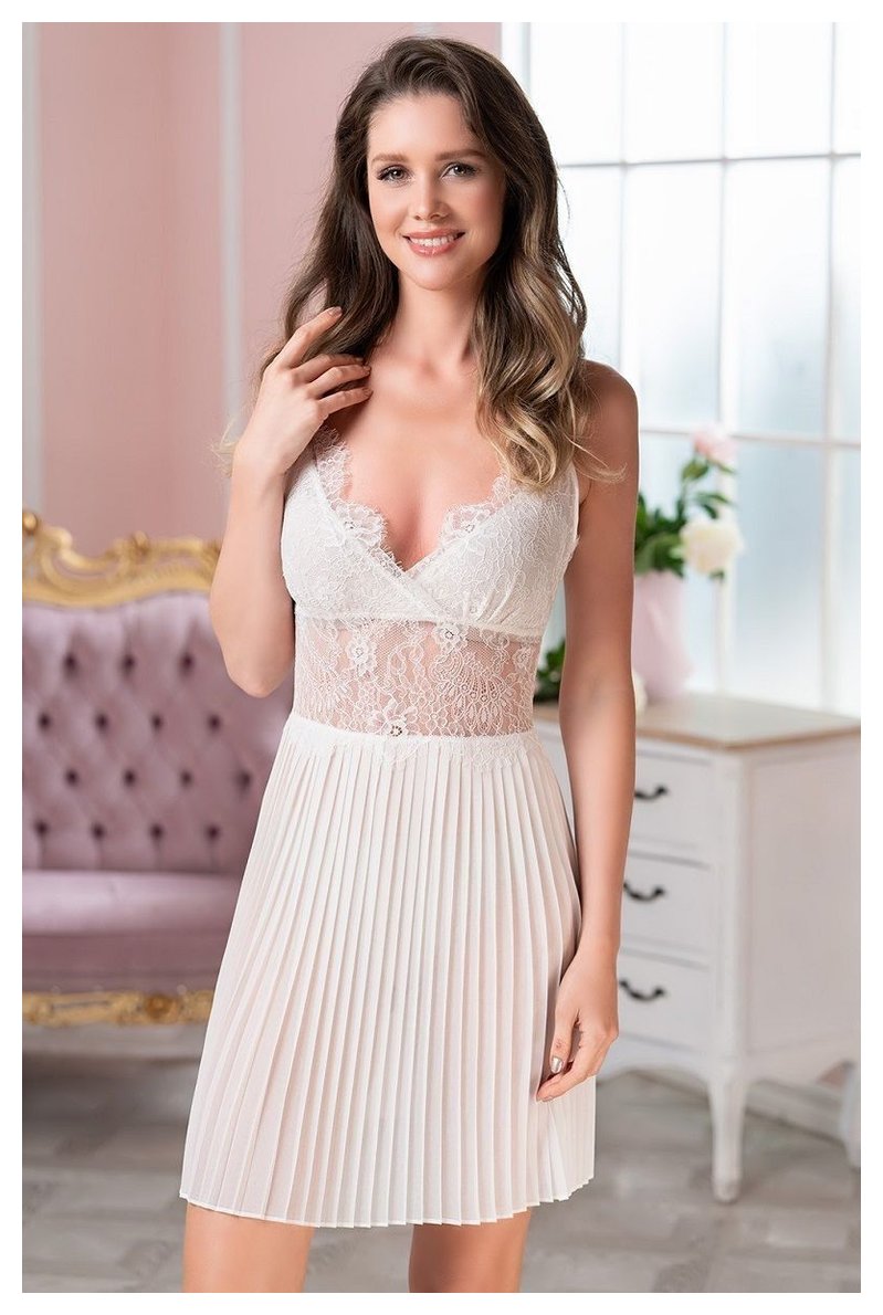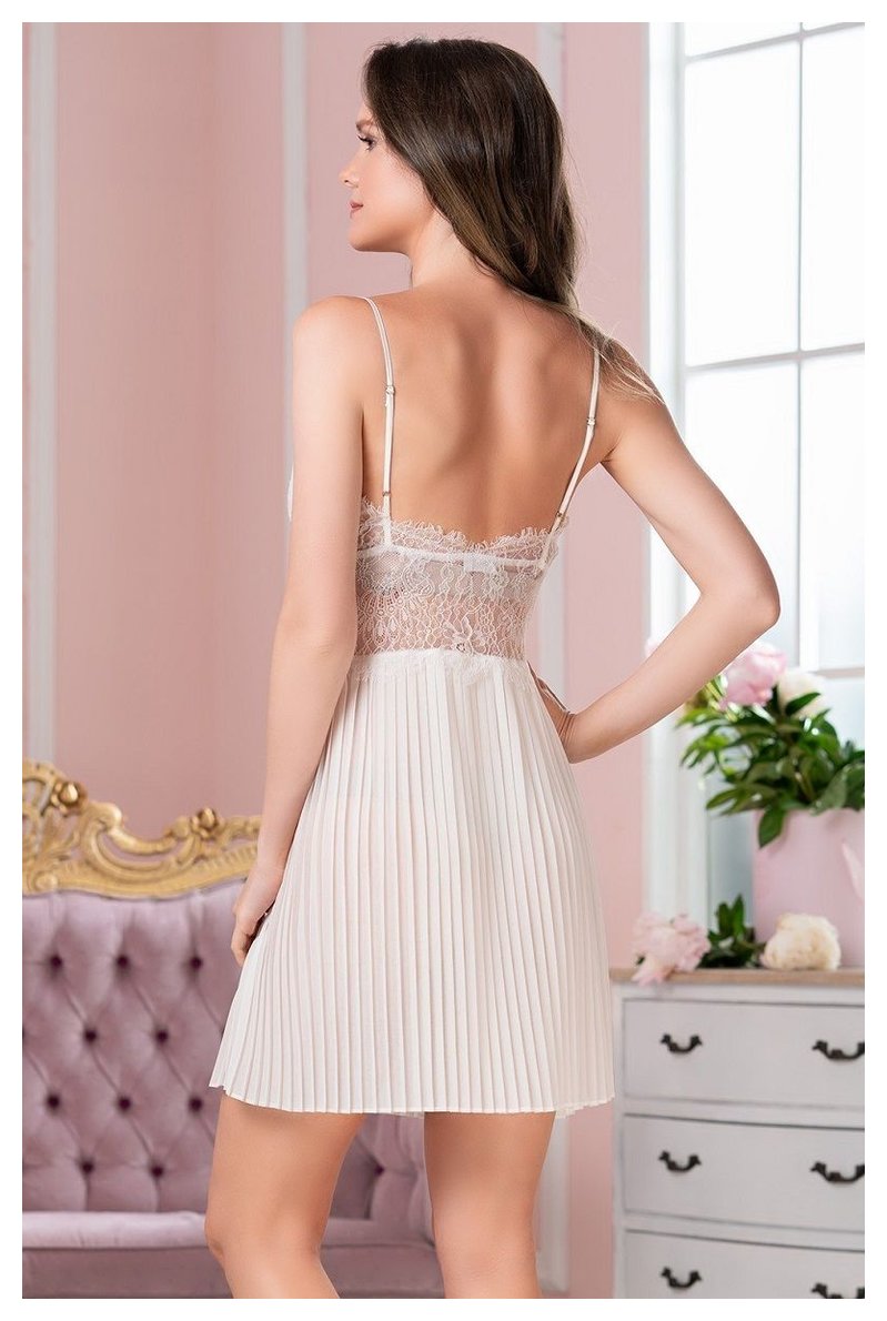 Короткая сорочка на тонких регулируемых бретелях из атласного полотна выполнена в сочетании с тонким кружевом и шифоном-плиссе. Лиф сорочки с отрезными чашками выполнен из тонкого кружева. Отрезная юбка сорочки – из легкого струящегося плиссированного шифона.